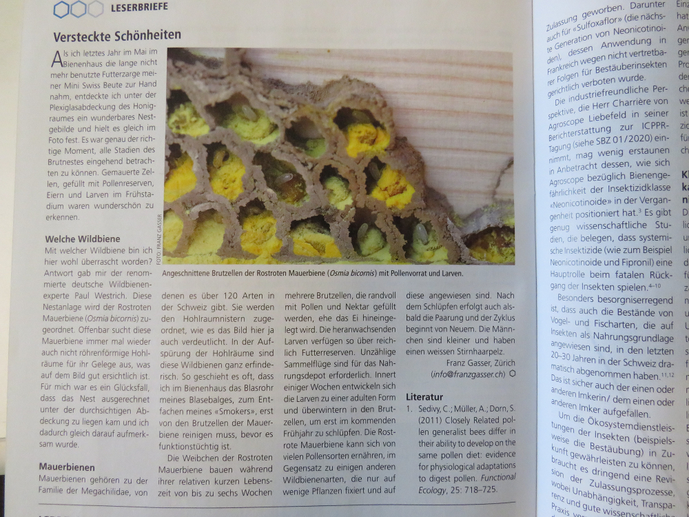 Aber es geht noch krasser. In der März-Ausgabe der Schweizerischen Bienen-Zeitung erschien gar ein Leserbrief, in dem ein Imker berichtet, wie die Rostrote Mauerniene Osmia bicornis in einer unbenutzten Futterzarge ihr Nest angelegt hatte - obwohl überhaubt kein runder, enger Hohlraum vorhanden war!