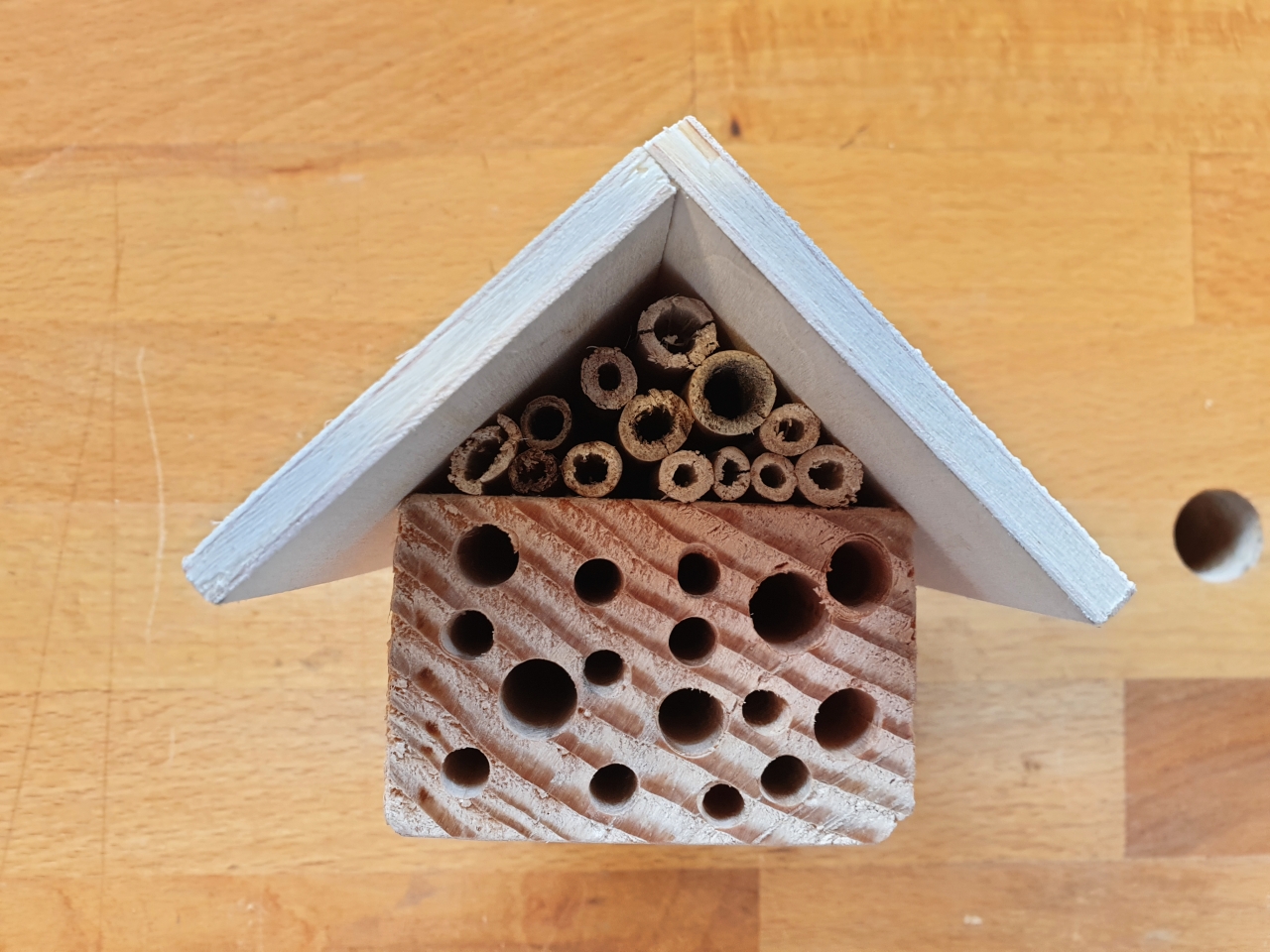 Das Dach des Mini-Insektenhotels ist 12cm lang und hat 3cm Überstand nach vorne, der Holzkörper und die Bambushalme sind somit 9cm lang. Im Holzkörper sind Bohrlöcher mit den Durchmessern von 10, 8, 6 und 5mm alle etwa 8cm tief eingebohrt. Der Holzkörper selbst ist 4,5 x 7cm unbehandelte Douglasie.