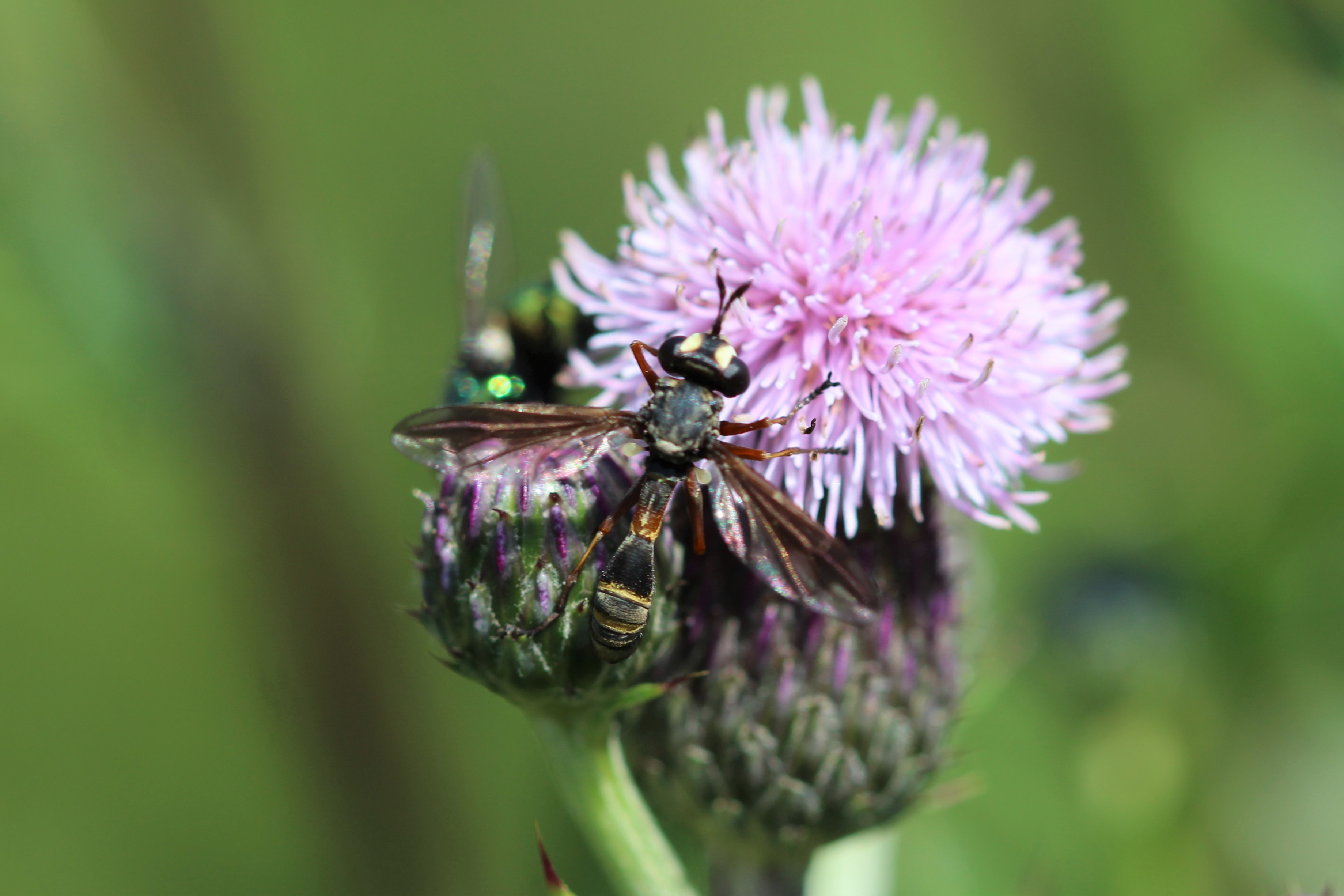 Das ist natürlich keine Hummel, sondern eine 10 bis 15mm lange Fliege, mit ausgesprochen guter Wespen-Mimikry. Ich stelle das Tier aber trotzdem hier rein, weil es sich um einen Hummelparasit handelt.