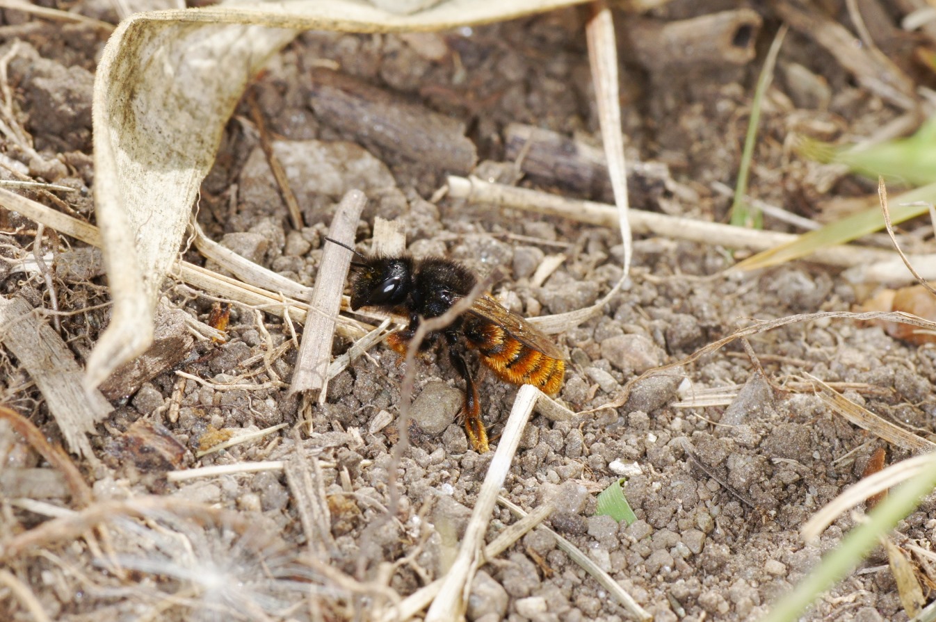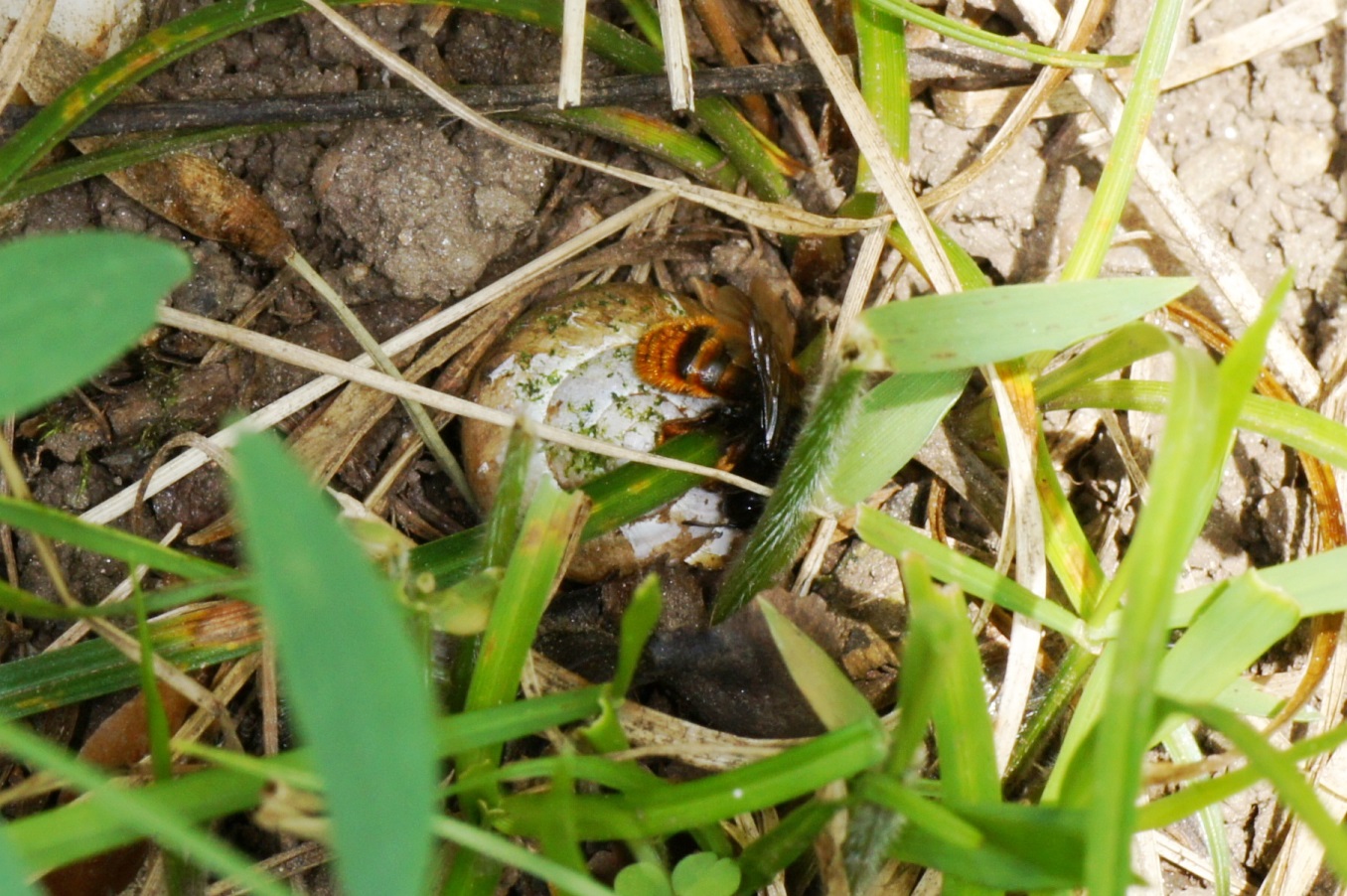 Jedes Jahr beobachte ich Osmia bicolor, die Zweifarbige Schneckenhausbiene in meinem Steingarten. Sie sucht sich herumliegende kleine leere Schneckenhäuser um ihre Brut dort unterzubringen. Der Nestverschluss erfolgt mit Pflanzenmörtel und dann wird das Nest mit im Flug herbeigeschleppten Halmen getarnt. In einem modernen "aufgeräumten" Garten mit Golfplatzrasen kann man das nicht beobachten und es wäre wohl auch nicht erwünscht..........