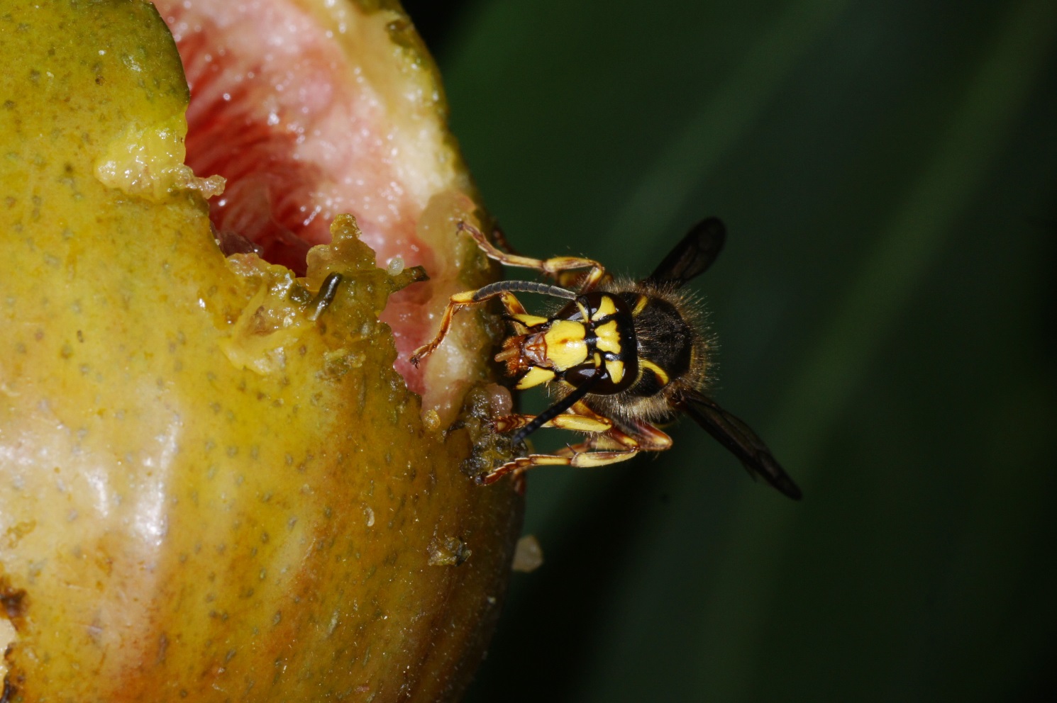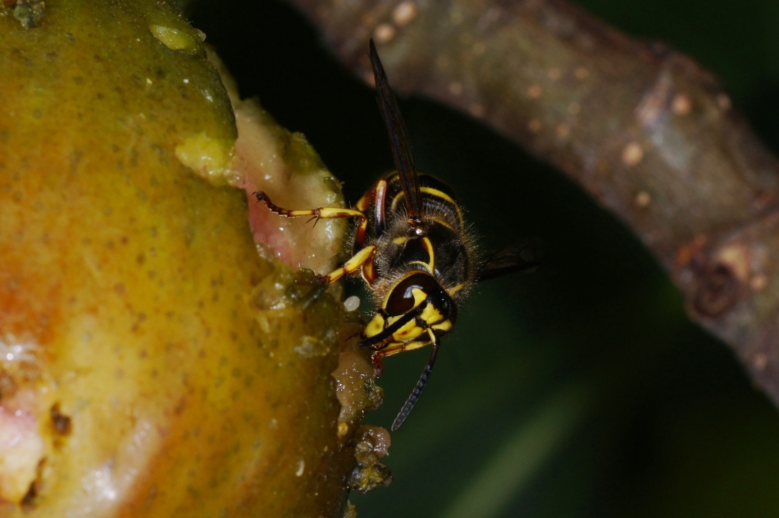 Jedes Jahr das selbe: Im vorigen Jahr haben Amseln und Gartengrasmücken (!!) meine Feigenbäume abgeerntet, in diesem Jahr treten Sperlinge (!!) und Wespen in den Vordergrund. Nun, wenigstens etwas, endlich haben wir ein "Wespenjahr" und ich kann diese niedlichen Tierchen genau beobachten: Kurzkopfwespen (Vespula germanica, V. vulgaris in Massen, einzelne Vespa crabro und jede Menge Polistes dominula) und: nach vielen Jahren kann ich wieder 2 Exemplare von Vespula media (vermute ich!) beobachten, eine seltene Art, die ich viele Jahre nicht zu Gesicht bekam. Vor unzähligen Jahren hatten wir einmal ein Nest dieser Art in unserer Gartenhecke, aber die Tiere waren deutlich dunkler gefärbt. Jetzt habe ich im Internet und bei der hervorragenden Hornissen-Seite recherchiert (http://www.vespa-crabro.com/unterscheidung.htm), aber das Bildmaterial hat mich da wie dort keineswegs zufrieden gestellt: Offenbar ist die Farbgestaltung von V. media sehr unterschiedlich, vielleicht regional oder generell.