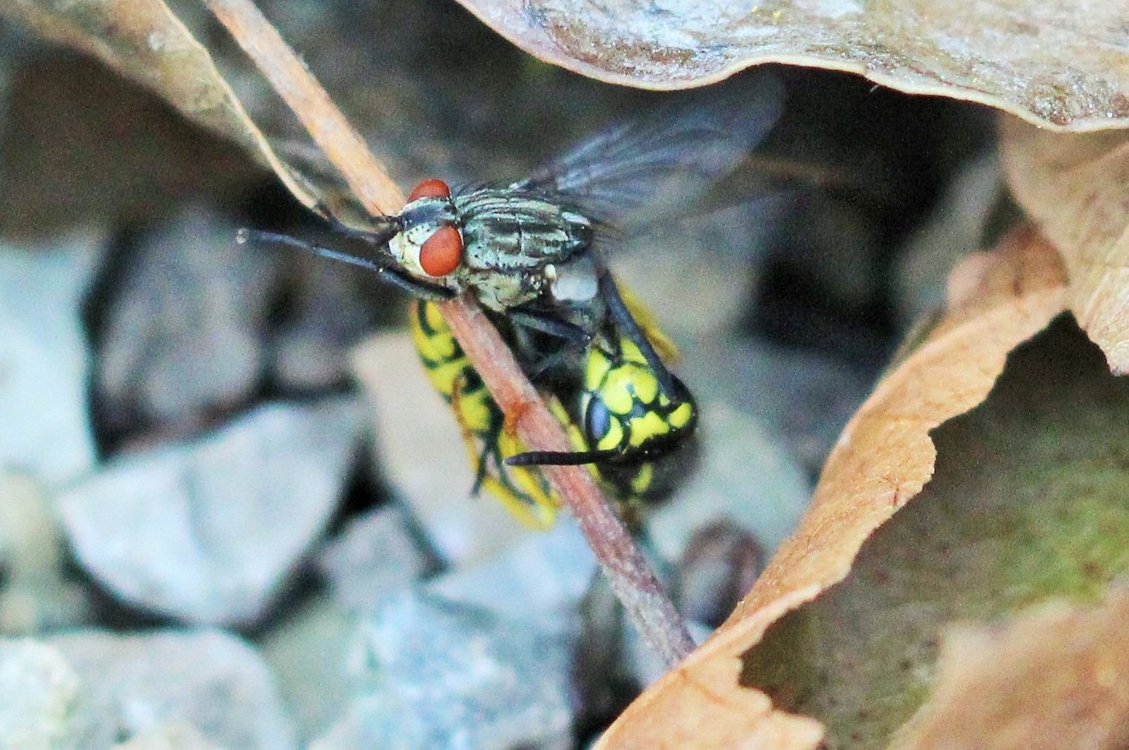 Weniger Glück hat diese Fleischfliege, sie fällt am Fusse des Efeus einer Vespula germanica zum Opfer: