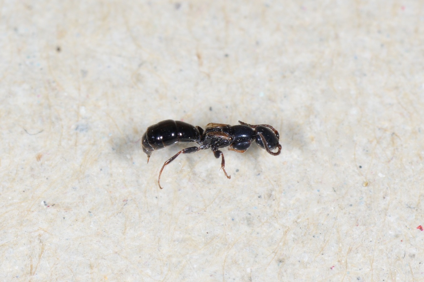 Bei der Durchsicht v. Belegen, die mir ein Kollege von der östlichen Grenze Österreichs (zur Slowakei) mitgebracht hat, fand ich dieses Exemplar neben ein paar Mutillidae (Ameisenwespen). Auf den ersten Blick denkt man an eine Ponera sp. (aber ohne Petiolus!). Deuten die kurzen Flügelstummel auf einen Kurzflügler (Staphylinidae) hin? Wohl nicht, die deutliche Abschnürung zwischen Mesosoma und Gaster sowie der ausgefahrene Stachel auf einem der Bilder deuten auf eine Wespe hin. Das Tierchen ist knapp 5 mm lang. Hat jemand eine Ahnung was es sein könnte?