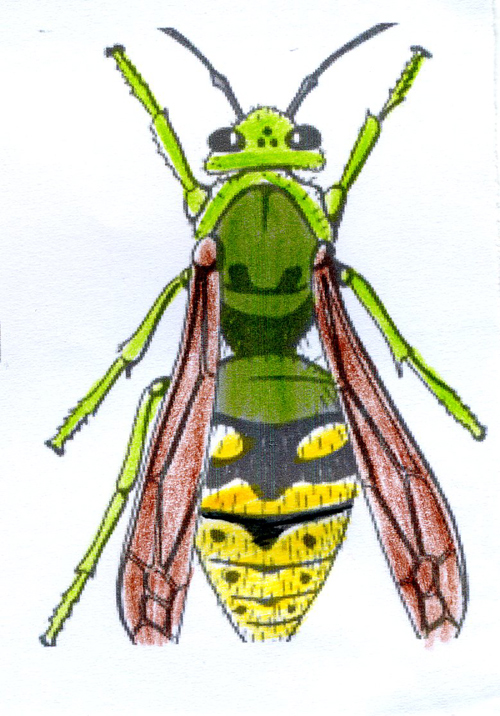 Das Tier hatte in den 1980er Jahren versucht, in einem Vogelnistkasten ein Volk zu gründen. Der Zugang wurde verstopft, und nach einigen Tagen wurde die inzwischen tote Hornisse herausgeholt: Sie hatte die in der Zeichnung gezeigte ungewöhnliche Farbe! Sie war nicht metallisch, sondern matt.