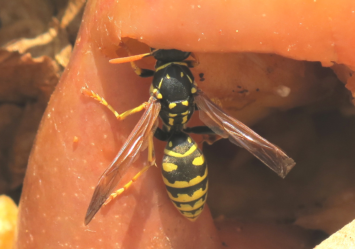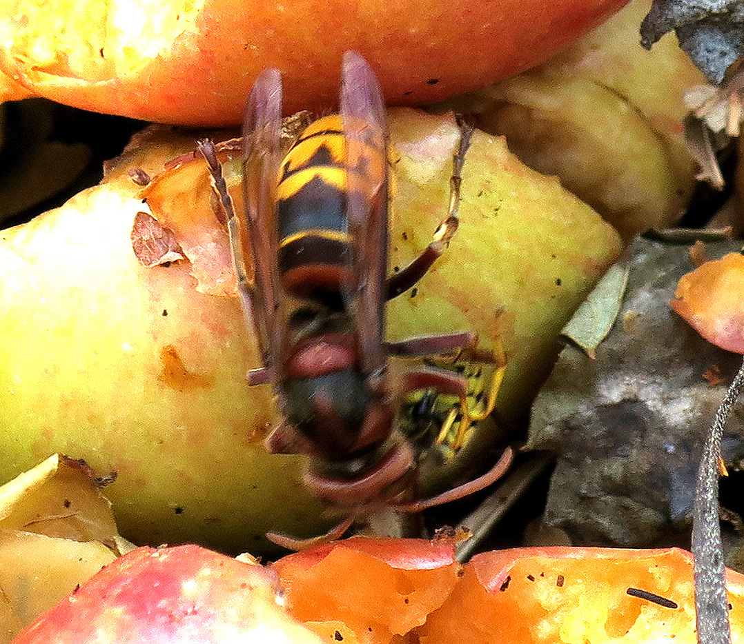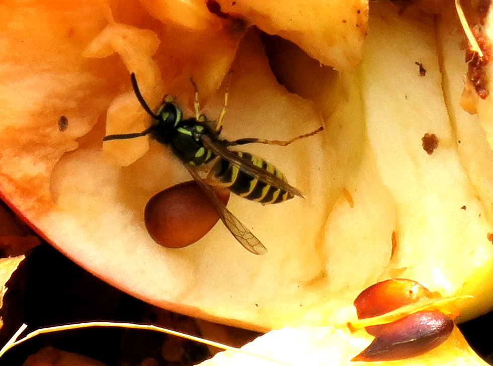 Der Kompost wird entsprechend reichlich besucht, und ganz besonders werden die saftigen Apfelreste von den Gemeinen Wespen ausgebeutet: