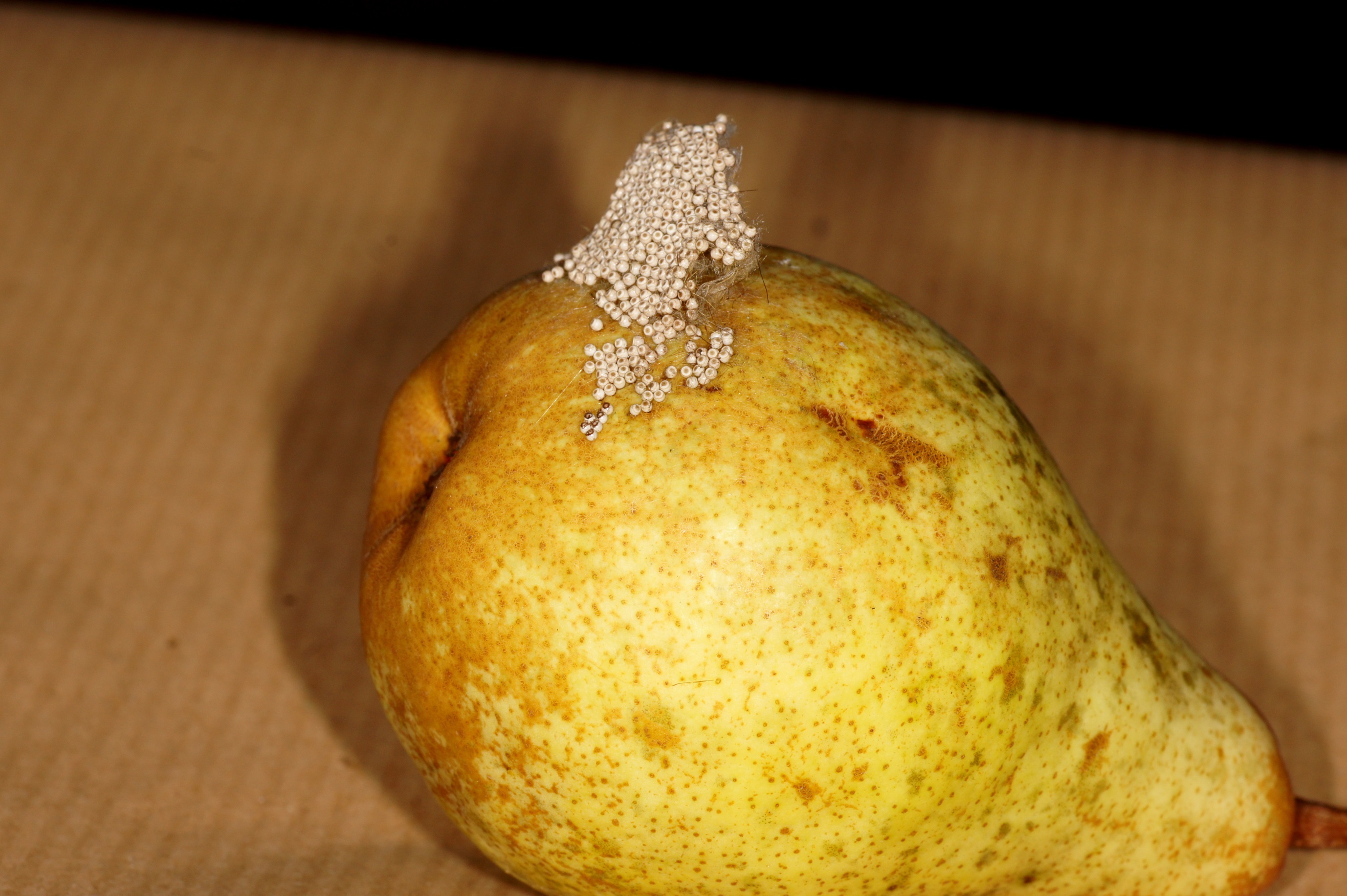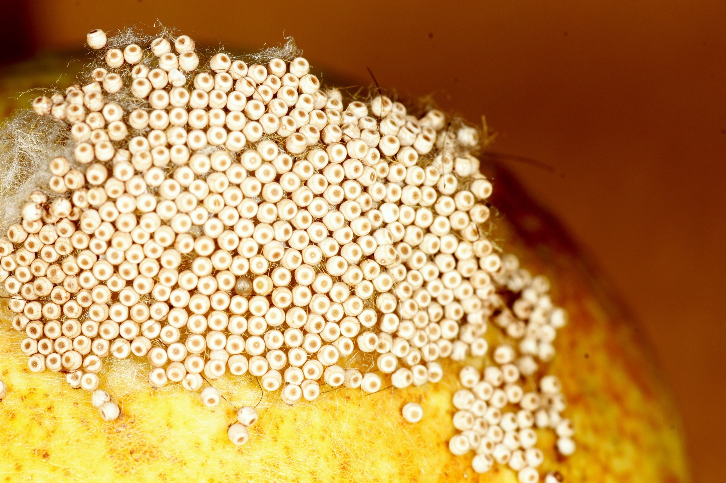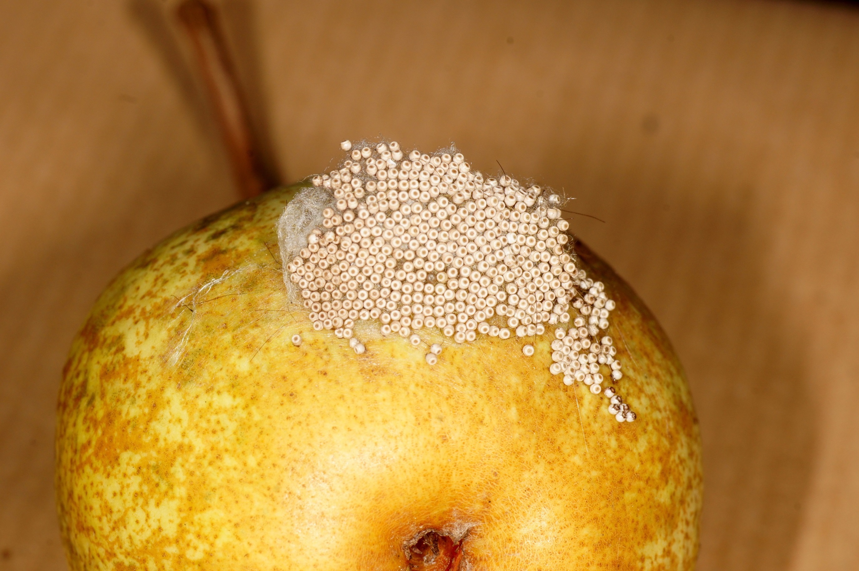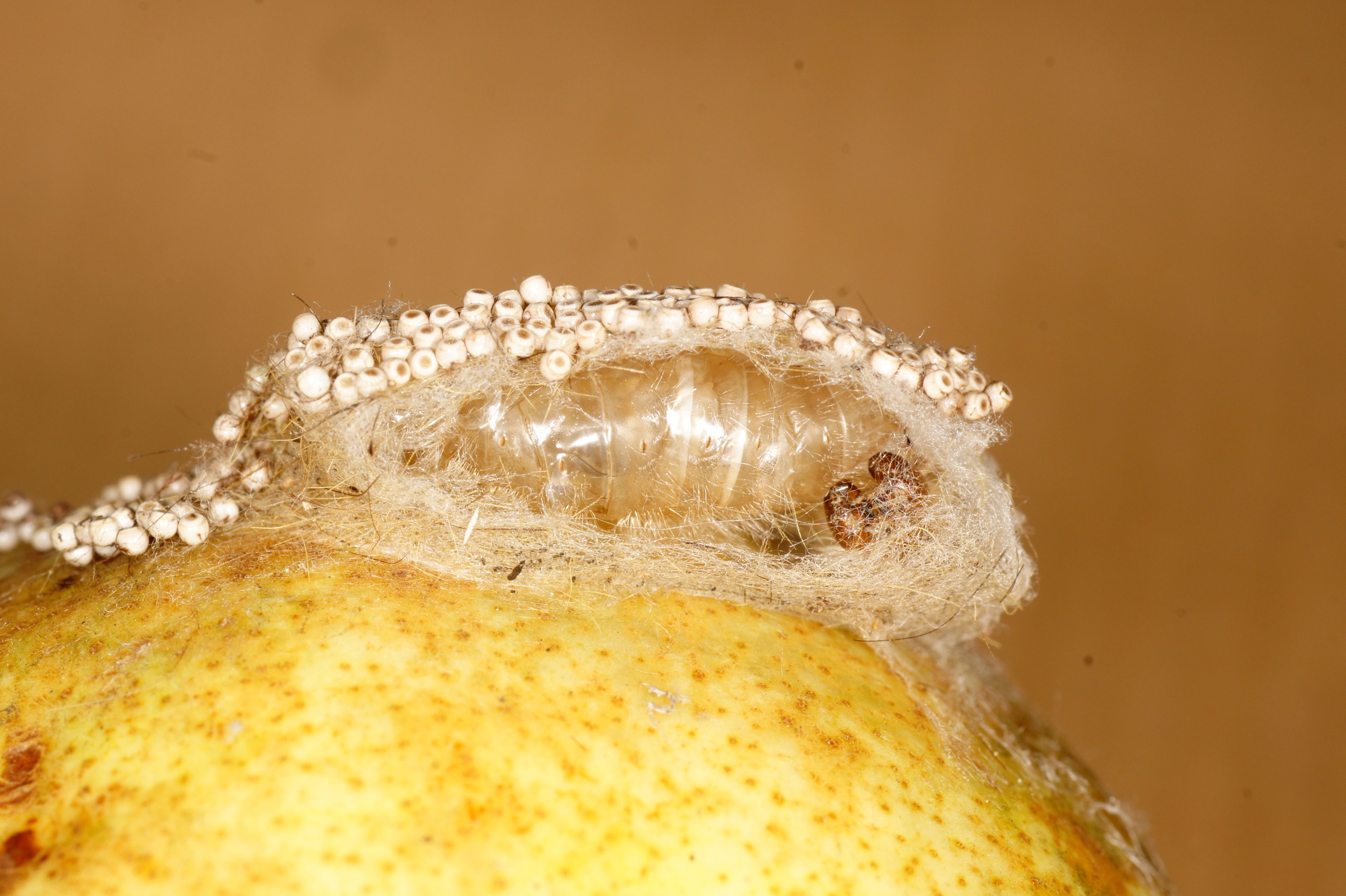 Im Garten habe ich einen kleinen Birnenbaum mit schönen Früchten. Anlässlich der Ernte im September hielt ich plötzlich eine Frucht in der Hand, die sofort meine Aufmerksamkeit erregte: Ein Eiergelege nicht nur auf der Birnenoberfläche, sondern auch auf einem leeren Kokon eines Insekts. Ob hier ein Zusammenhang besteht, war mir nicht klar. Ein Kollege im Naturwiss. Verein hat mich aufgeklärt: das ist mit hoher Wahrscheinlichkeit eine Gelege von Orgyia antiqua, dem Schlehenspinner. Ein tagaktiver Schmetterling, der sein Gelege mit Vorliebe dort ablegt, wo er selbst geschlüpft ist! Damit habe ich nicht gerechnet..... zum Glück habe ich nicht alles verspeist!
