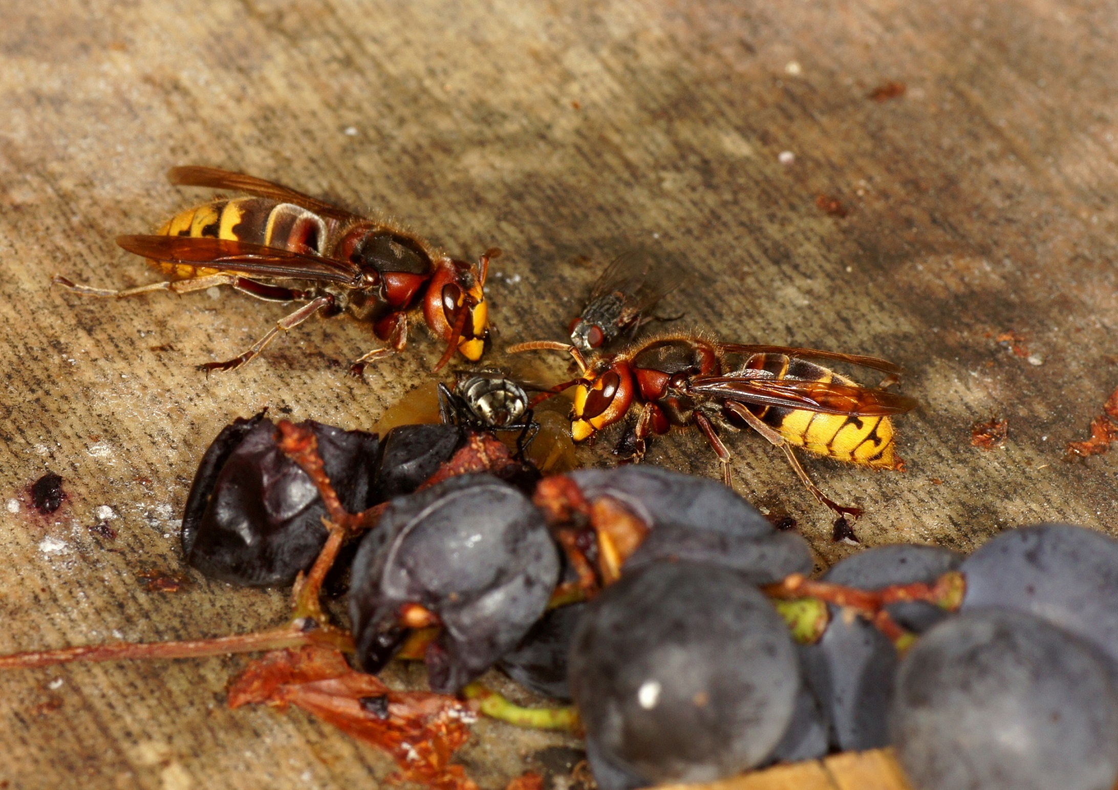 2 Arbeiterinnen nebeneinander, diese Individuen müssen vom gleichen Nest sein. Fliegen haben nichts mehr zu befürchten, die Hornissen gehen nicht mehr auf die Jagd und benötigen kaum mehr Proteine, da keine Brut aufgezogen wird; die Fliegen scheinen das zu "wissen."