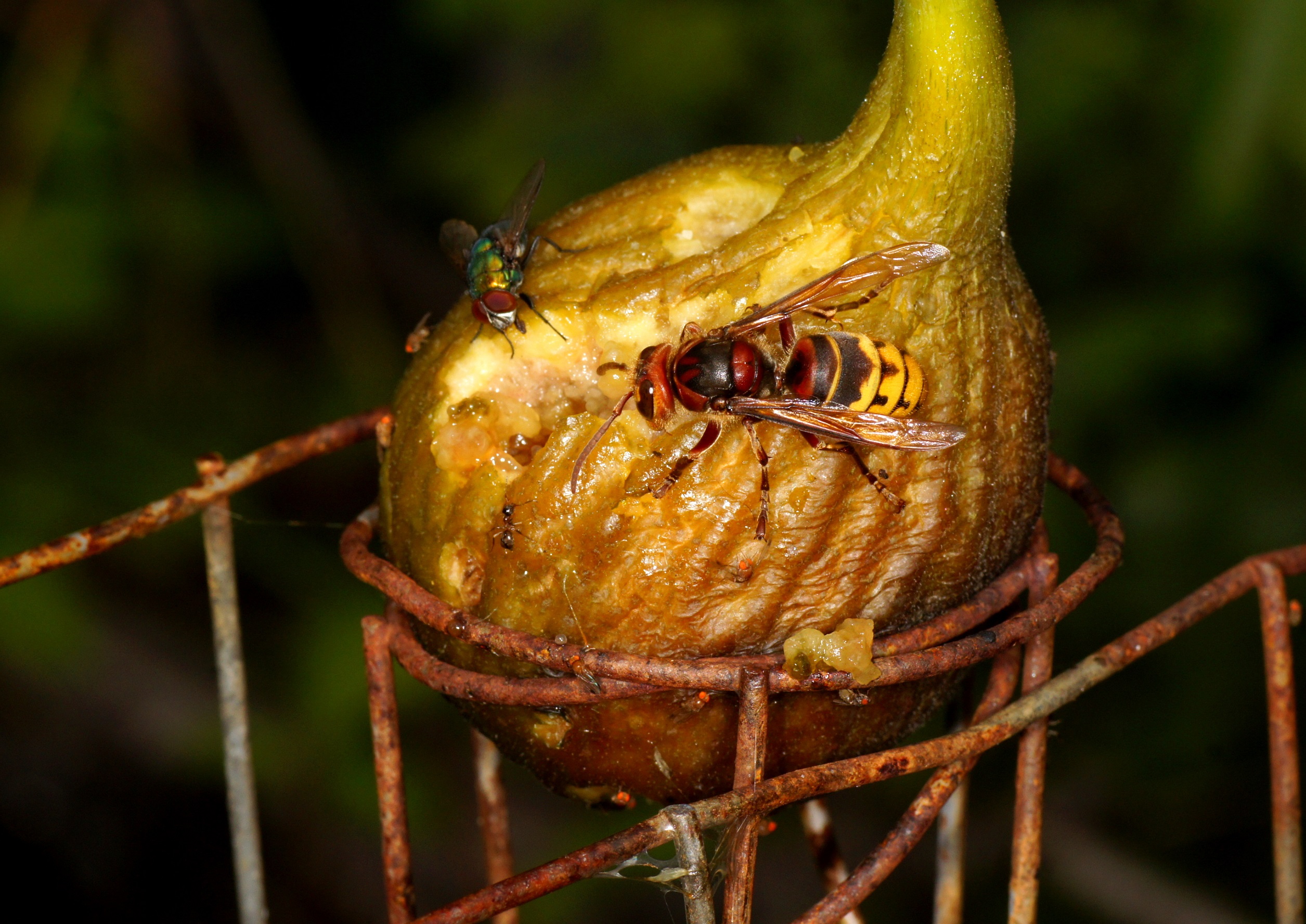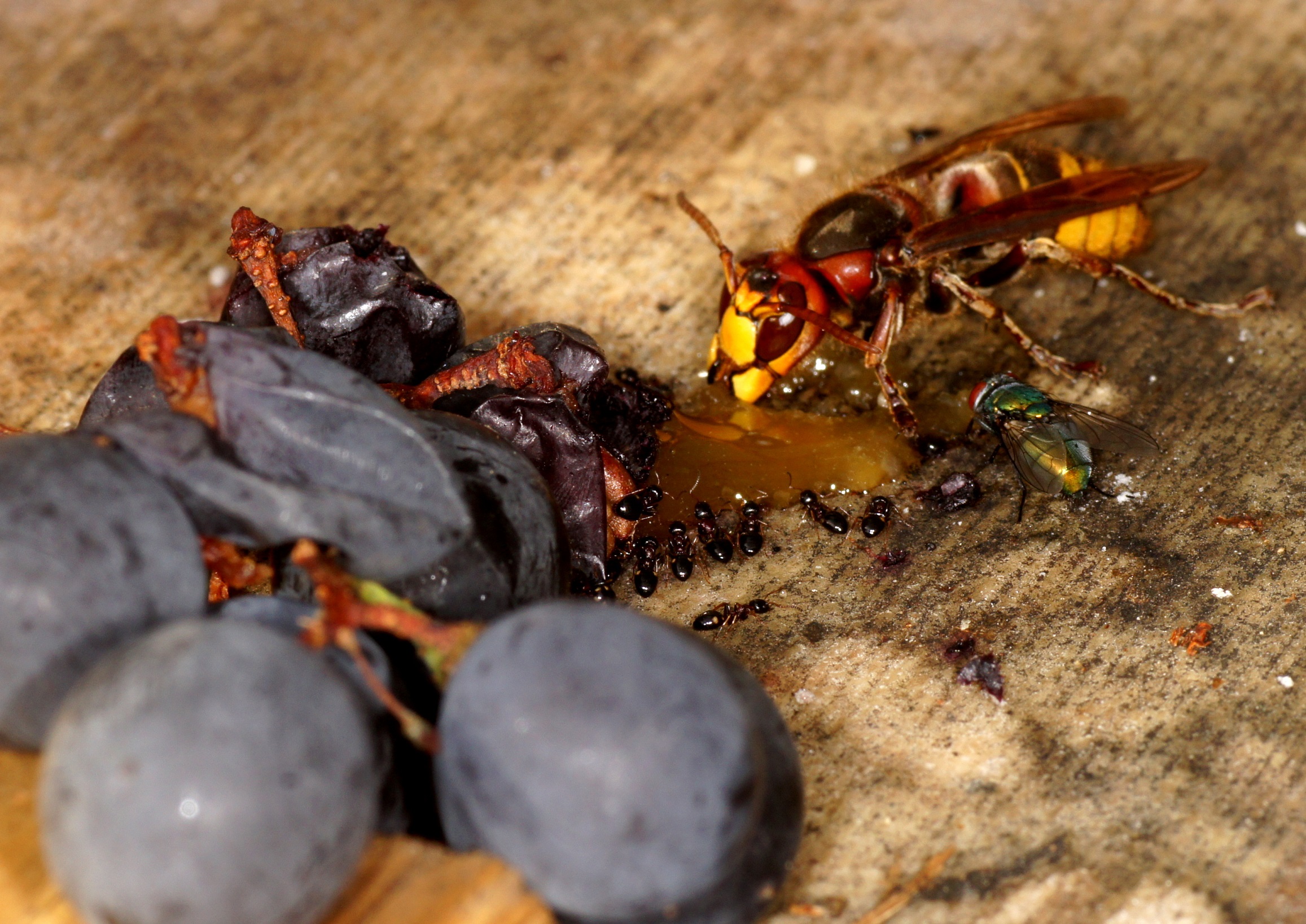 Sichtung der ersten Hornissen-Arbeiterin im Jahr 2023. Obwohl im Stadtgebiet von Klagenfurt, stellen sich jedes Jahr einige Hornissen ein um hier auf die Jagd zu gehen oder an süßen Früchten zu naschen. Der regenreichste Sommer in diesem Jahrhundert hat bei uns einen Einbruch bei den Populationen etlicher Insekten zur Folge (nicht jedoch bei Gelsen, die haben ein "Mastjahr"!). Vespula-Arten sind hier ausgesprochen selten zu sehen, von der bekannten "Lästigkeit" keine Rede. Heute habe ich die erste Arbeiterin v. Vespa crabro im Garten gesehen, auf einer ungenießbaren Feige, die von der Kirschessigfliege befallen war. Diese Früchte werden dann immer den Insekten überlassen: V. crabro, Fliegen, Lasius niger, Dolichoderus quadripunctatus (nicht sichtbar, auf der Rückseite) und die kleinen "rotäugigen" Fliegen, vermutlich die Kirschessigfliegen. Hin und wieder auch ein Rosenkäfer.