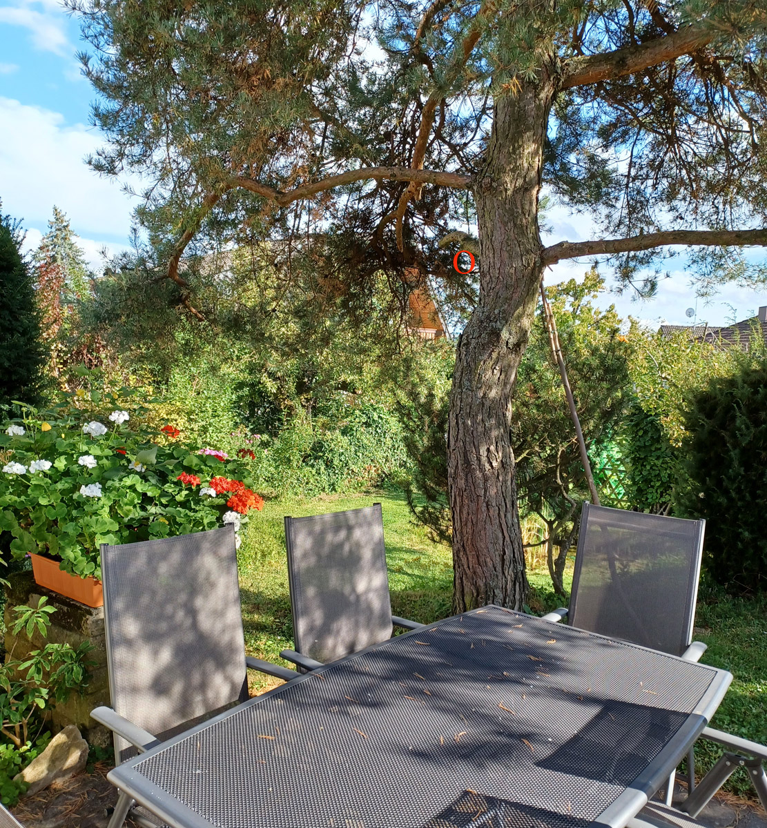 Bei dem roten Kringel hing der Kasten, ganz nah über dem Tisch auf der Terrasse, wo wir immer mal wieder saßen. Die Hornissen haben uns nie gestört!