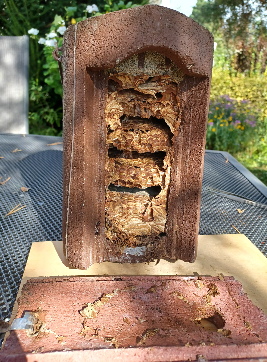 Inzwischen trage ich mich mit dem Gedanken, eine zweite Nistgelegenheit daneben zu hängen. Für ein richtig großes Nest ist der Meisenkasten zu klein, aber Hornissen sollen ja sogar umziehen können.