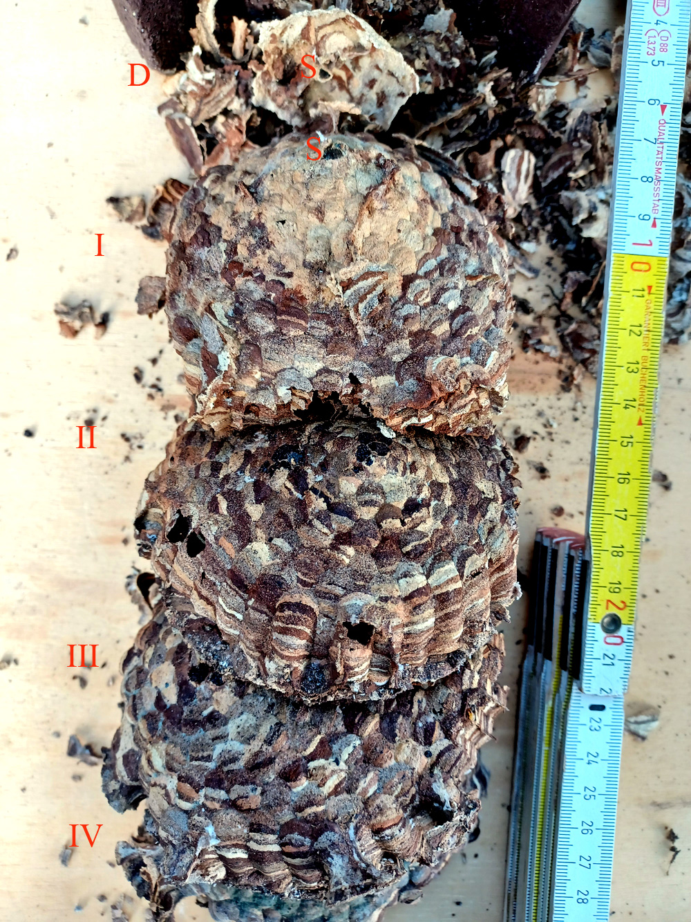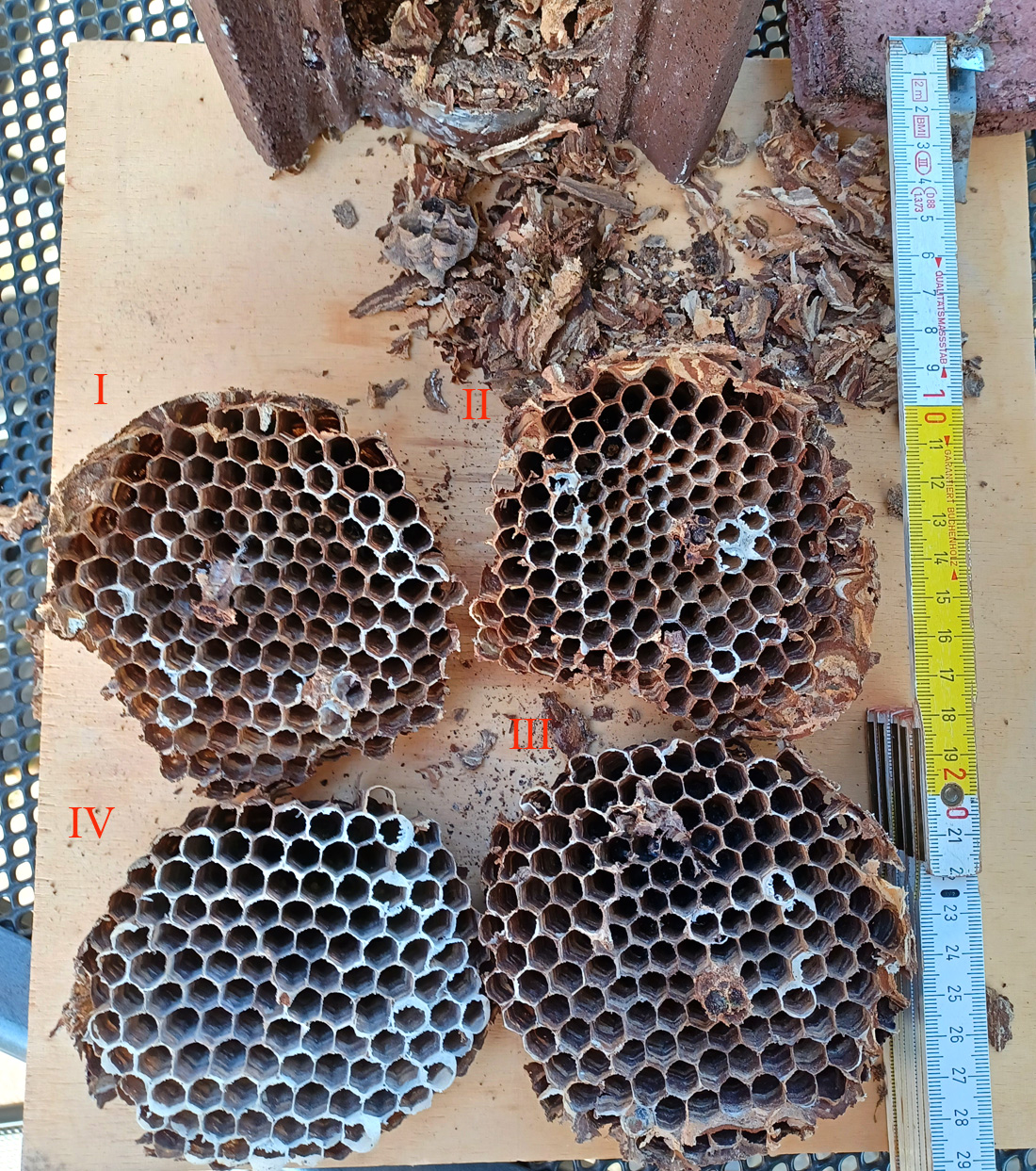 Die vier Wabenteller, von oben nach unten mit I bis IV nummeriert. Es müssen über 400 sein, wenig für ein Hornissennest, Wobei die oberen Waben wohl mehrfach Verwendung fanden. Vor allem am IV. Teller sind noch die hellen Reste der Gespinstkuppeln zu sehen, die sich die Larven vor der Verpuppung gesponnen haben. Alle Zellen sind gleich groß, was zeigt, dass das Volk keine größeren Zellen für Männchen- und Jungköniginnen-Larven angelegt hat. Da ist etwas schiefgegangen; vermutlich war der Nistraum zu klein, und auch die Königin dürfte frühzeitig abgegangen sein.