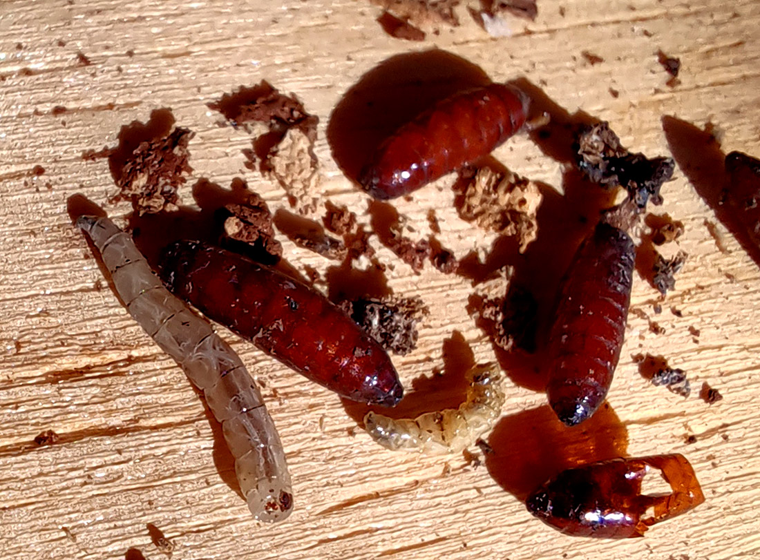 m Gemüll unter den Waben konnte ich einige Puppen und zwei Maden einer Fliegenart entdecken. Während des Sommers lungerten auch oft ein bis zwei Fliegen um das Flugloch herum. Wurden sie von einer Hornisse entdeckt, krabbelten sie gerade mal ein paar Schrittchen zur Seite ud kamen dann rasch zurück. Es handelt sich wohl um eine Art, deren Larven sich von Futterresten und Müll der Hornissen ernähren. Die Fliegen selbst ähneln üblichen Stubenfliegen. Um welche Art es sich handelt, konnte ich nicht herausfinden.