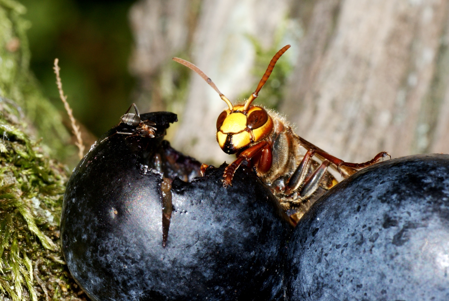 Die Hornisse (Arbeiterin) blickt "erstaunt" auf die nahe F. cunicularia-Arbeiterin