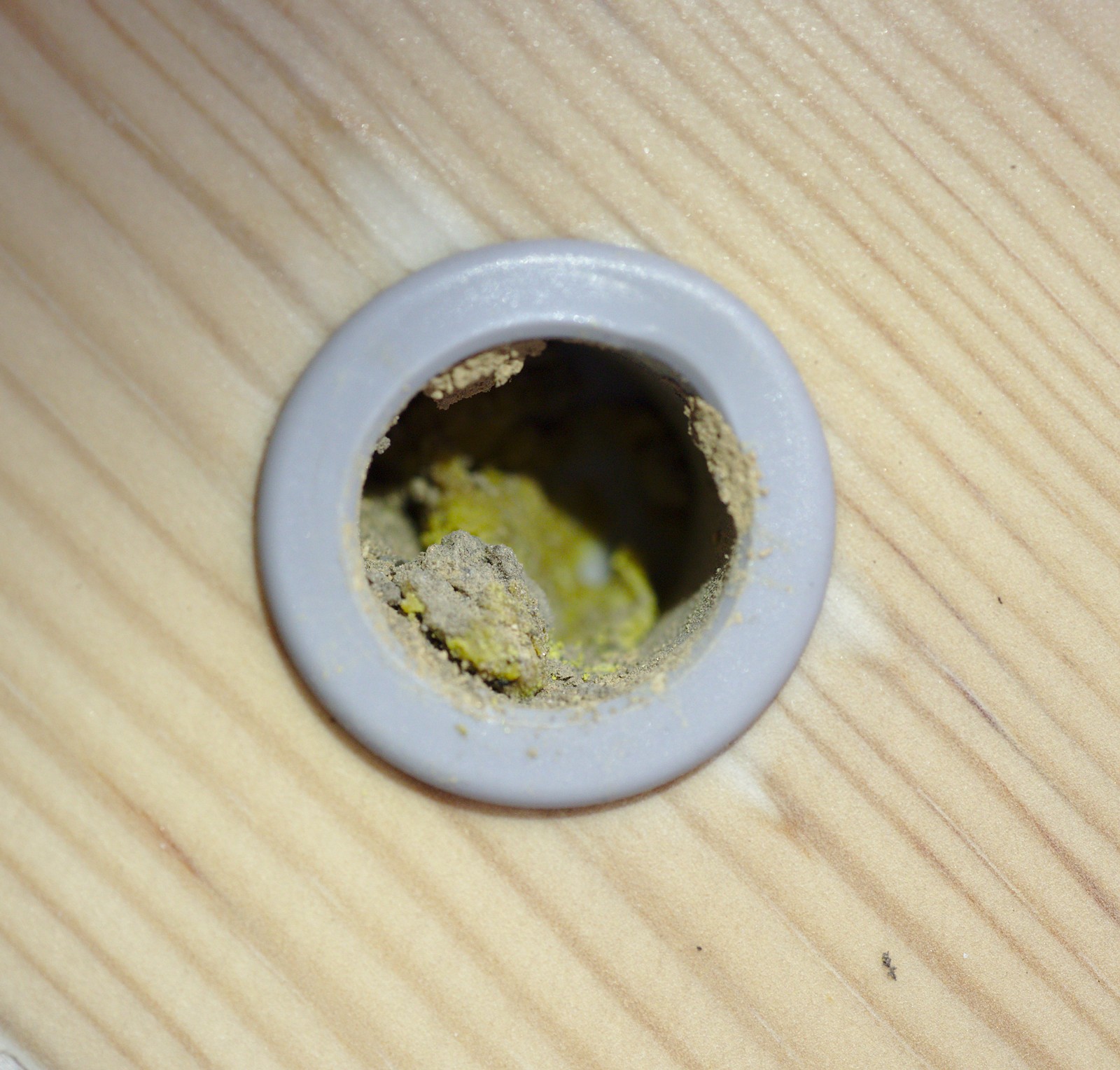 ich wohne seit einiger Zeit in einer Dachgeschosswohnung und letzten, sowie diesen Frühling sind mir vermehrt Bienen aufgefallen, die von den Dachfenstern wie magisch angezogen werden. Oft wache ich morgens auf, weil am Fenster direkt über meinem Bett ein durchgehendes Summen zu hören ist :D Erst dachte ich, dass der Fensterkit oder so süßlich riecht, sodass die Tiere immer wieder angelockt werden. Heute bemerkte meine Freundin allerdings, dass in den Löchern, die zum befestigen der Dachfenster während der Reinigung gedacht sind, Erde drin ist. Tatsächlich waren die Löcher an allen Fenster dicht mit Lehm verschlossen und hinter dieser recht harten Lehmschicht befand sind eine Art Nektar: