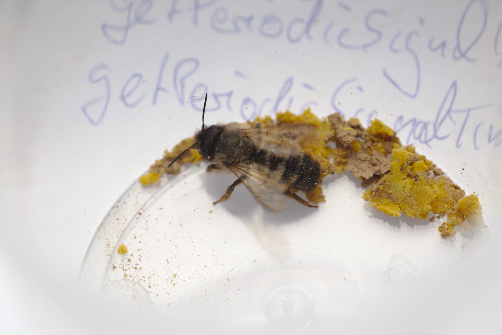 In einem Loch saß hinter der Lehmschicht, die eine Öffnung hatte, sogar noch eine Biene, die die Zerstörung ihres Nestes wohl gar nicht gut fand und recht wild wurde. Ich konnte sie allerdings fangen, in ein Gefäß einsperren um ein Foto schießen: