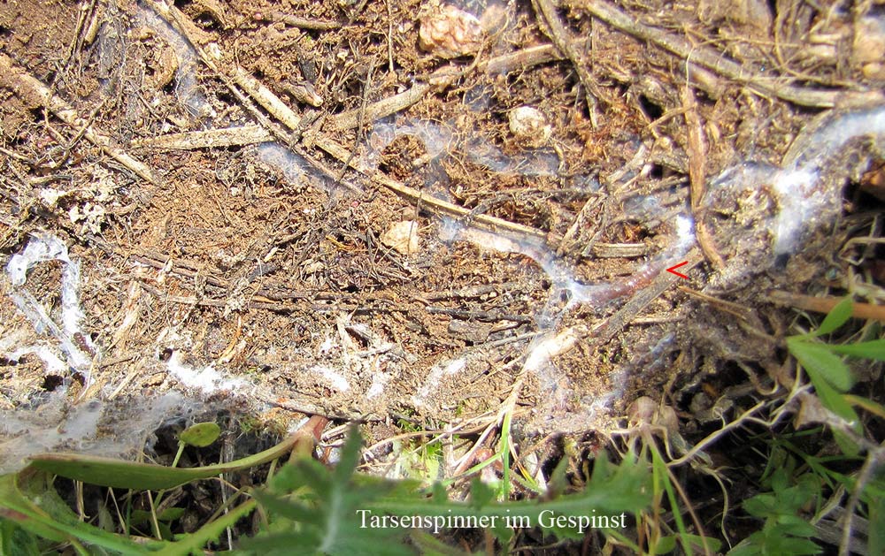 Bild 2: Die typischen Gespinströhren unter einem Stein. Unmittelbar links von der roten Pfeilspitze ist eines der Tierchen im Gespinst zu erkennen.