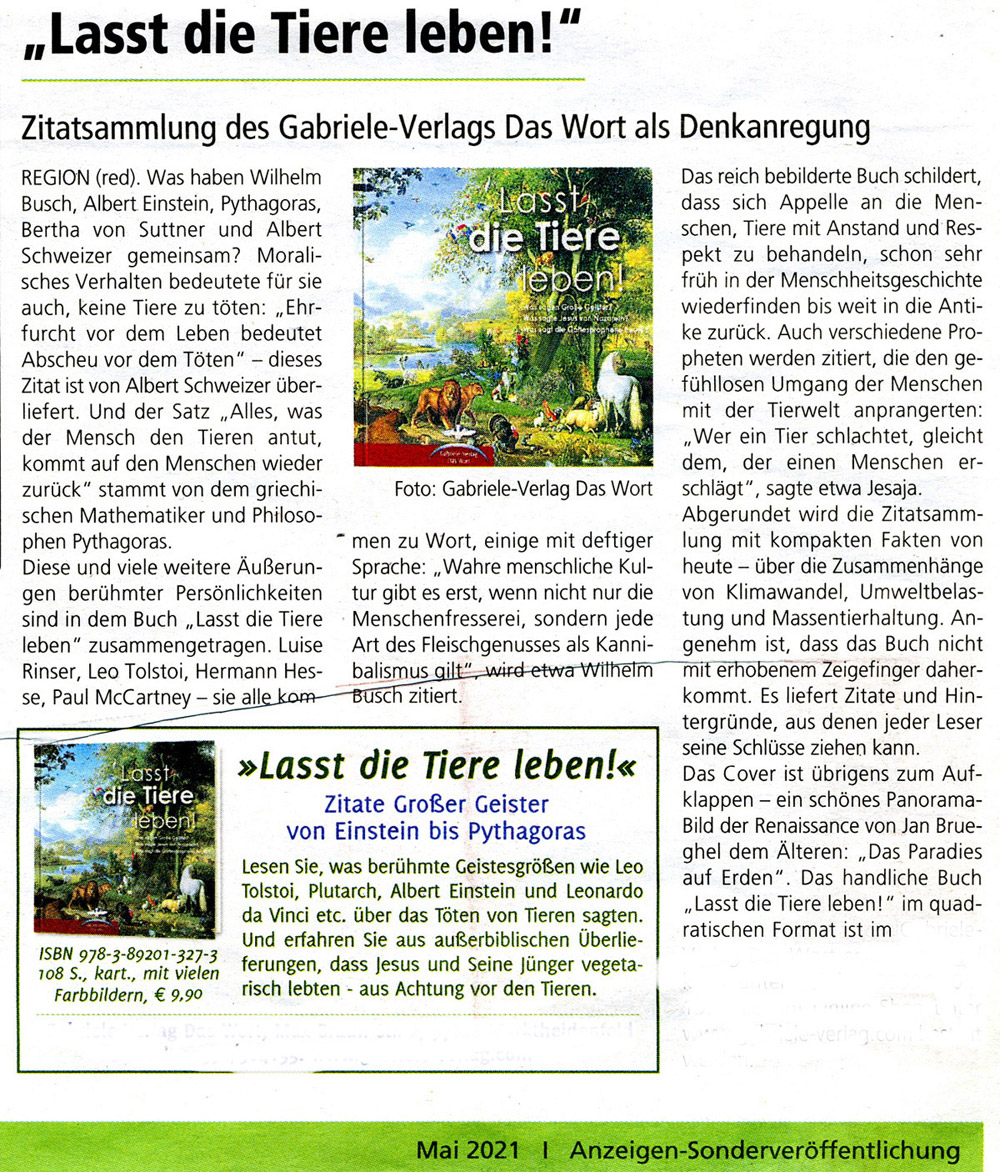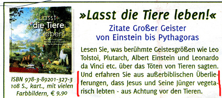 In einer Zeitungsbeilage wird für ein Buch geworben „Lasst die Tiere leben“, wird gegen den Fleischgenuss argumentiert.