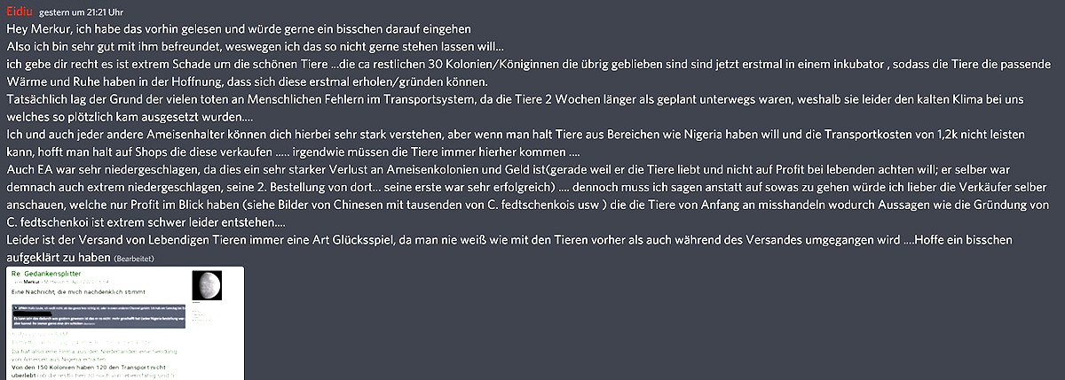 Meine Hoffnung ist, dass sich vielleicht doch einige Ameisenhalter ebenfalls Gedanken darüber machen, was sie mit dem Kauf solcher lebender „Produkte“ finanzieren, wofür sie letztlich (mit-)verantwortlich sind.