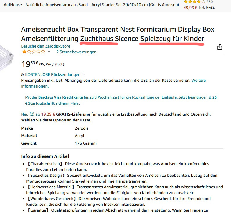 und die Bezeichnung „Ameisenzucht Box“ suggeriert, dass man in dem Ding Ameisen züchten kann, was mir zweifelhaft erscheint. Was „Sicence“ sein soll, dürft Ihr selber ergooglen. :roll: