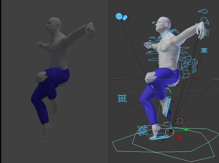 Links: Gerendertes Bild. Rechts: Modell mit armature