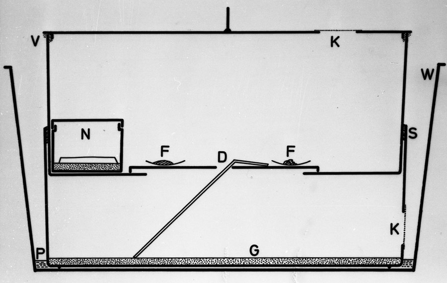 N ist eine solche Kammer, mit Überfalldeckel, Gipsboden und Karton. Der ganze zweistöckige Kasten stand in einer Wanne im Paraffinöl-Bad (P), Lüftungsgitter (K) im Deckel und unten in einer Seitenwand,