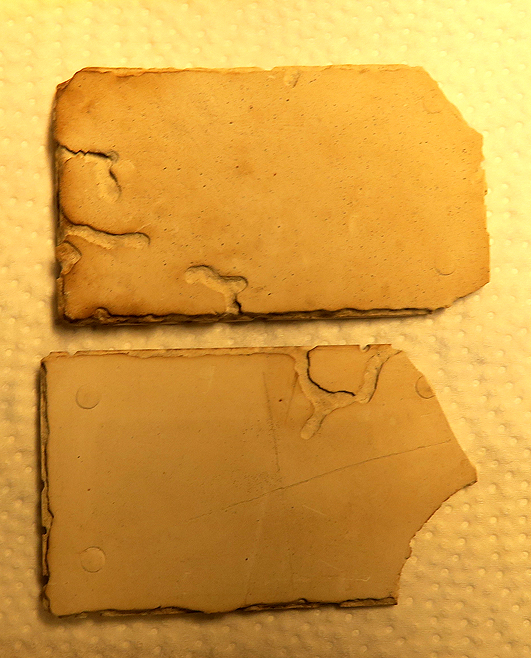 Zwei solcher Gipsböden nach längerem Gebrauch: Man erkennt, dass die Ränder ringsum „abgeknabbert“ sind und dass auf der Unterseite von den Rändern her einige Gänge angelegt wurden.