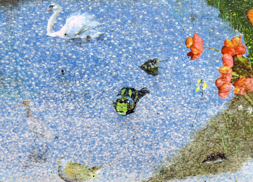Aber was ist das auffällige Ungeheuer, das da ziemlich in der Bildmitte auftaucht? Hat da ein Schottland-Urlauber unerlaubterweise ein Jungtier vom Loch Ness mitgebracht und in dem Teich entsorgt?