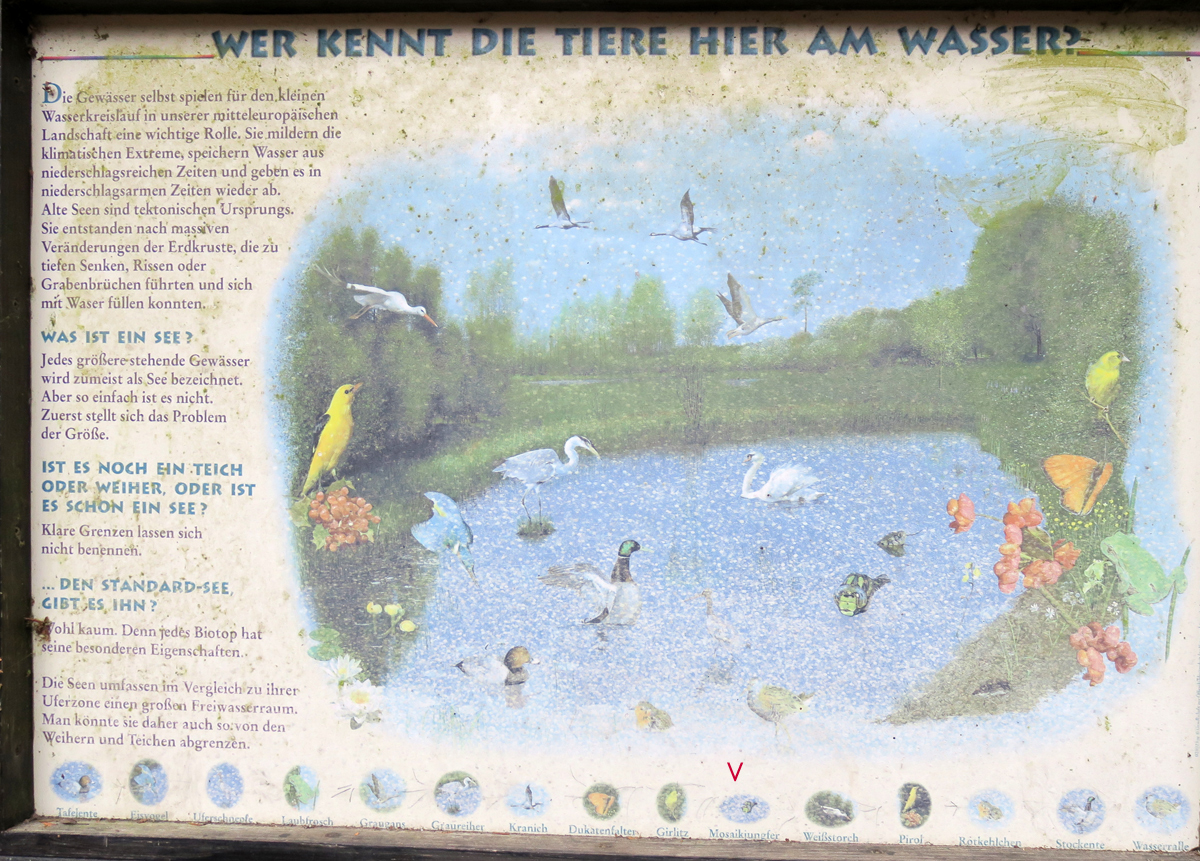stellen Dich schon vor das eine oder andere Rätsel. Da gibt es eine Tafel „Wer kennt die Tiere hier am Wasser?“