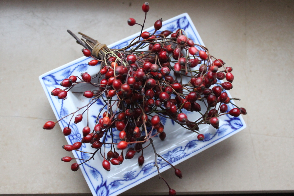 Bei einer Wanderung in der Umgebung hatten wir diese Zweige der Büschel-Rose (Rosa cf. multiflora) geschnitten und meine Frau hat 2 dekorative Trockensträuße mit diesen Mini-Hagebutten gebunden: