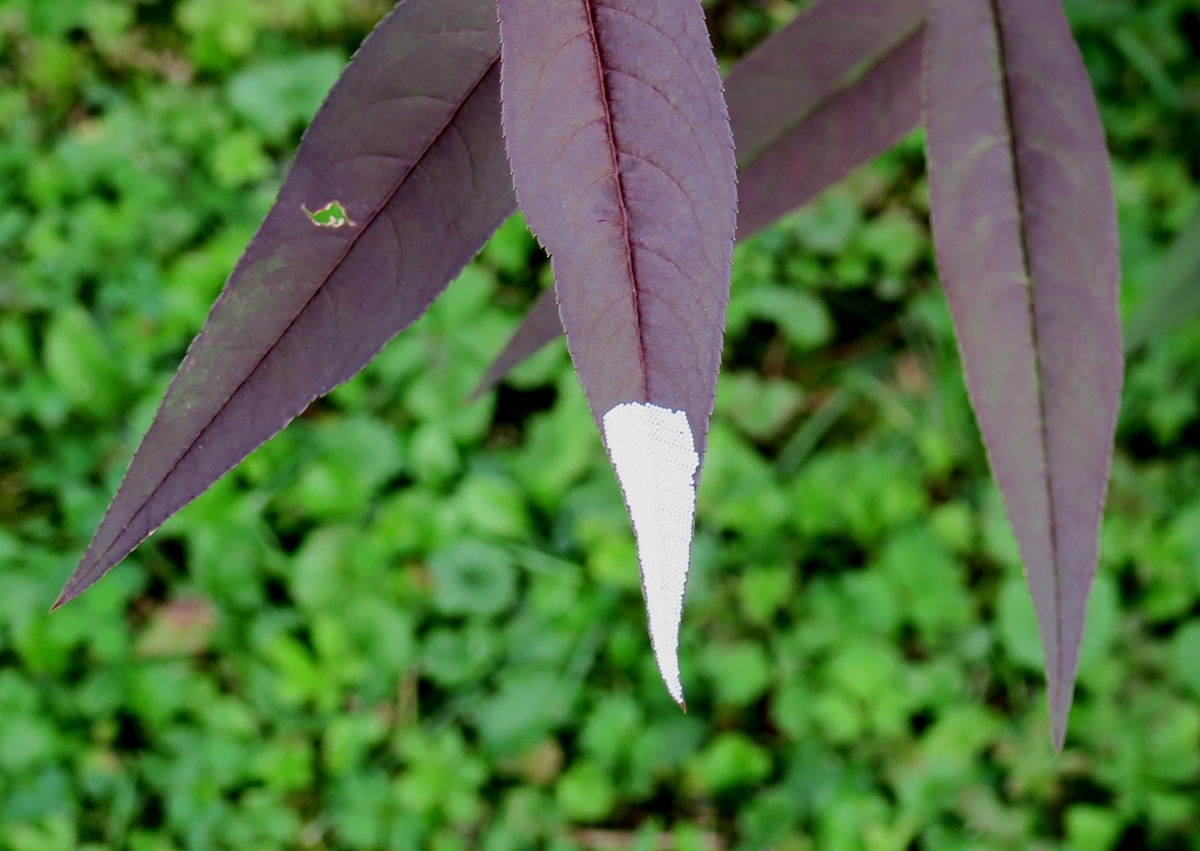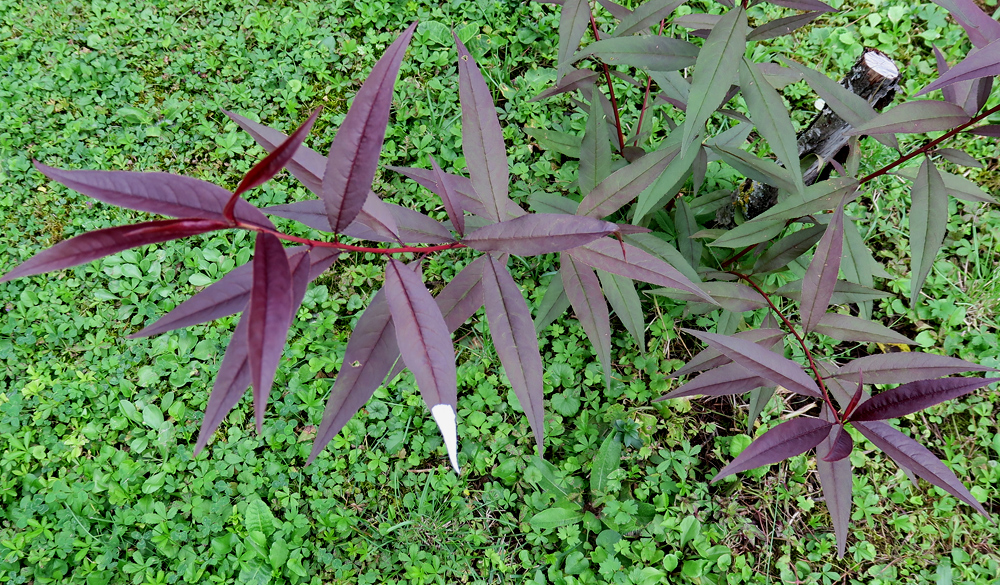 Die Pflanze wächst anscheinend aus dem Wurzelstock eines abgestorbenen Pfirsichbäumchens. Die rote Blattfarbe deutet darauf hin, dass es sich um einen „Blutpfirsich“ handelt,