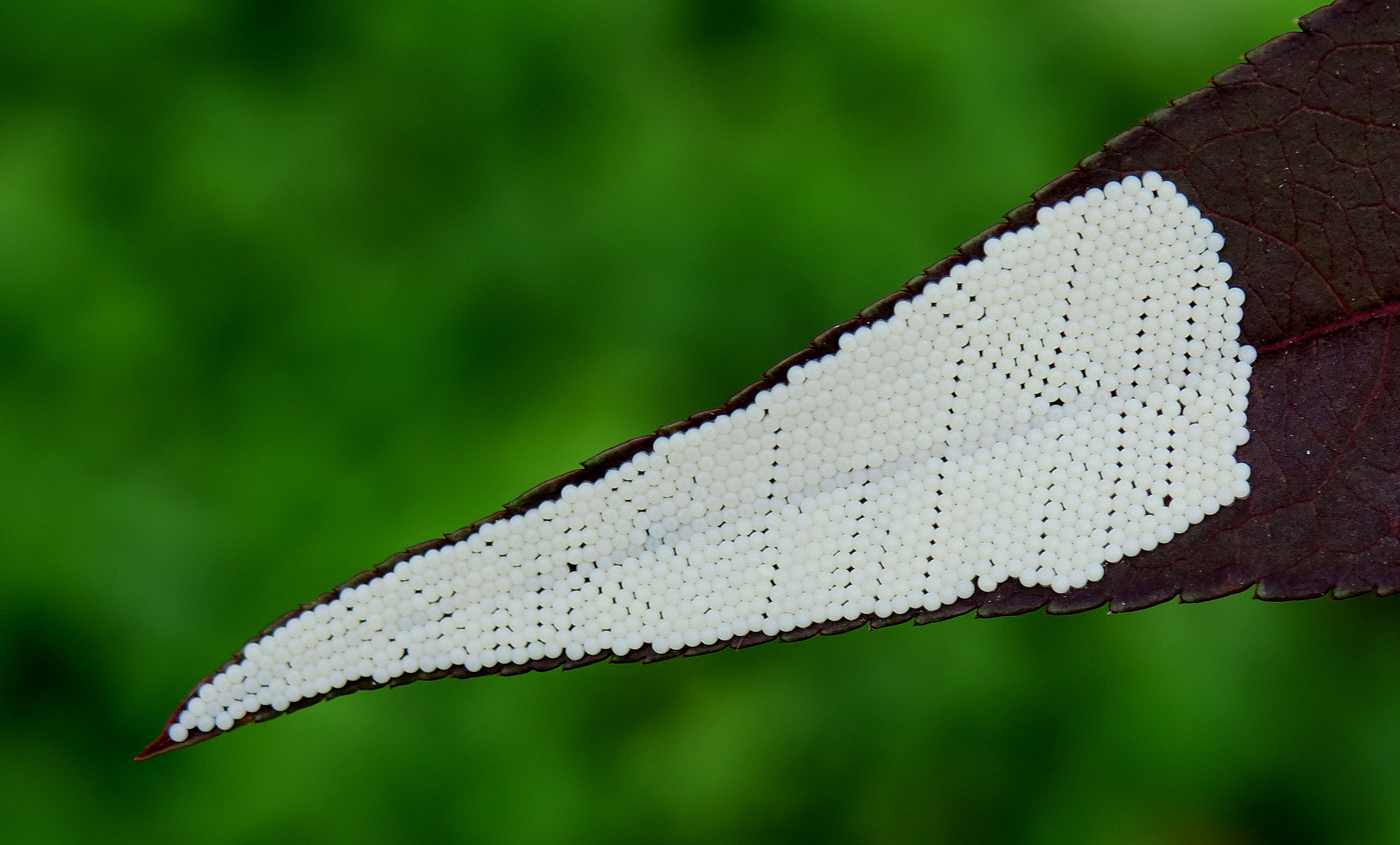 Es sind 909 Eier. Unwillkürlich versucht man hier auch herauszufinden, wo der Falter das erste davon mit seinem Hinterleibsende ablegte. Es muss die äußerste Blattspitze gewesen sein.