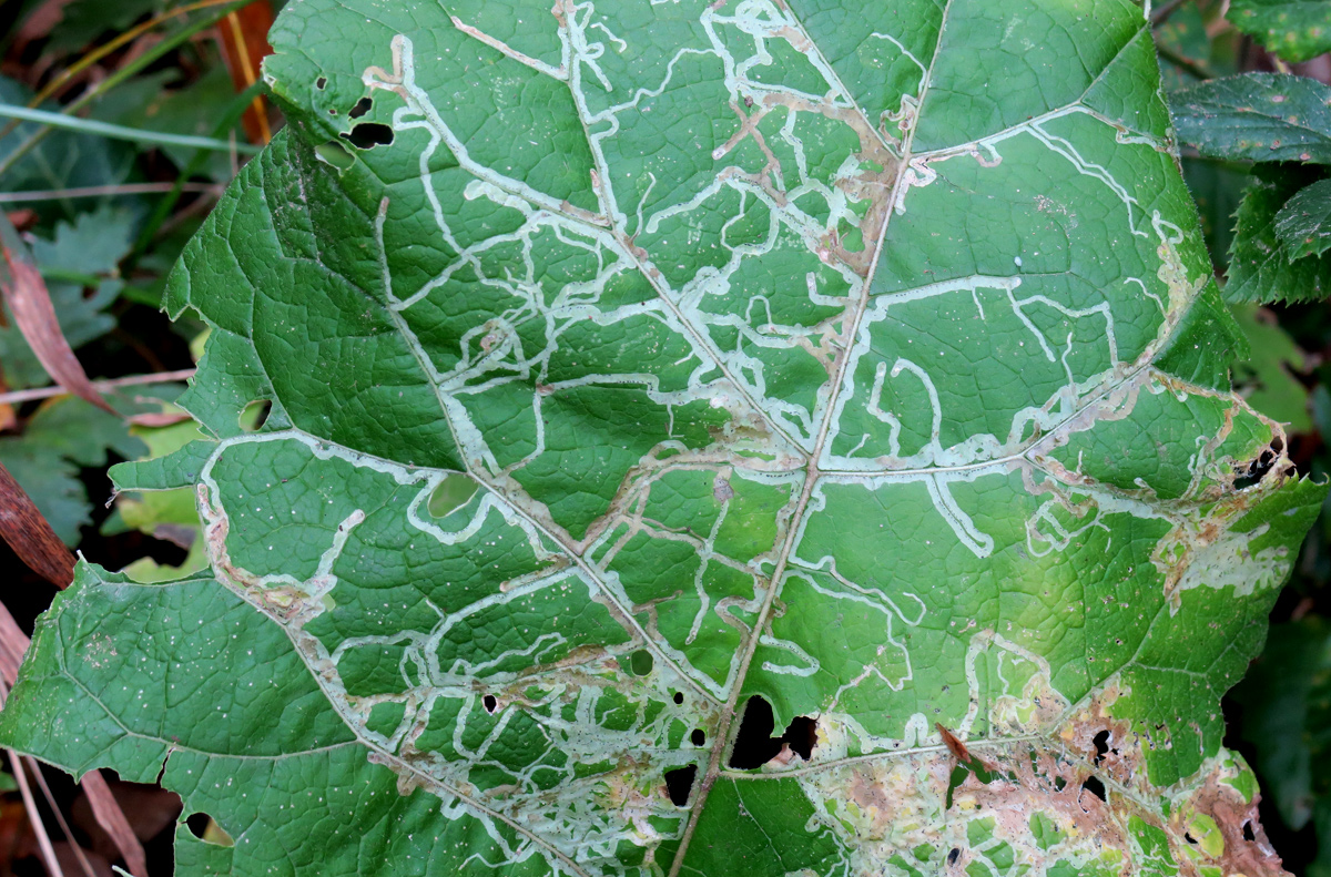 Die Minen werden von Larven einer Fliege verursacht, Phytomyza lappae, Fam. Agromyzidae, in den Blättern der Großen Klette.