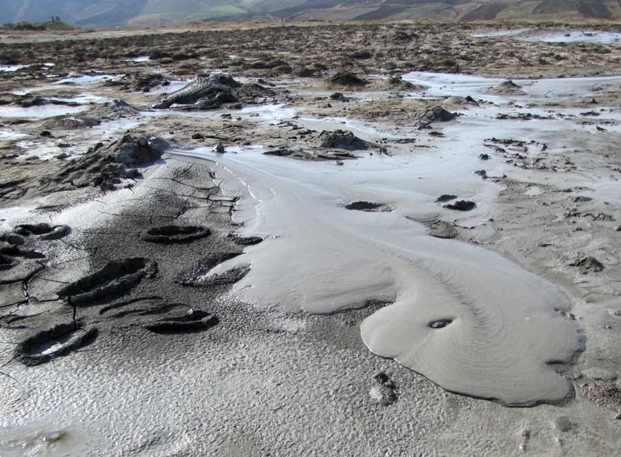 Was mich ein wenig stutzig macht, sind die kleinen Hügelchen. Meine Vermutung : irgendeine vulkanisch aktive Gegend. Könnten Schlammvulkane sein, wobei dann Vulkanismus nicht mehr so ganz zutrifft, wie mir Wikipedia grade beigebracht hat (kalter Vulkanismus - Diapirismus).