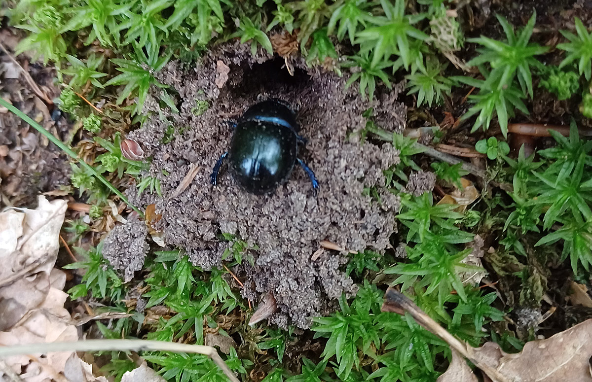 Wikipedia: „Waldmistkäfer ernähren sich von Kot, manchmal auch von Pilzen und Baumsäften. Männchen und Weibchen bauen im Frühjahr einen 70 bis 80 mm tiefen Stollen in den Erdboden[1], von dem mehrere Nebengänge abzweigen, die in Kammern enden. Die Weibchen besorgen die unterirdischen Arbeiten, die Männchen die oberirdischen, z. B. den Abtransport der ausgeworfenen Erde. In die Kammern wird je ein Ei gelegt und Kot eingebracht, von dem sich die Larven ernähren.“
