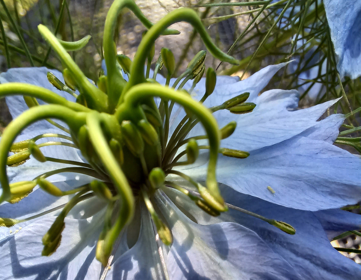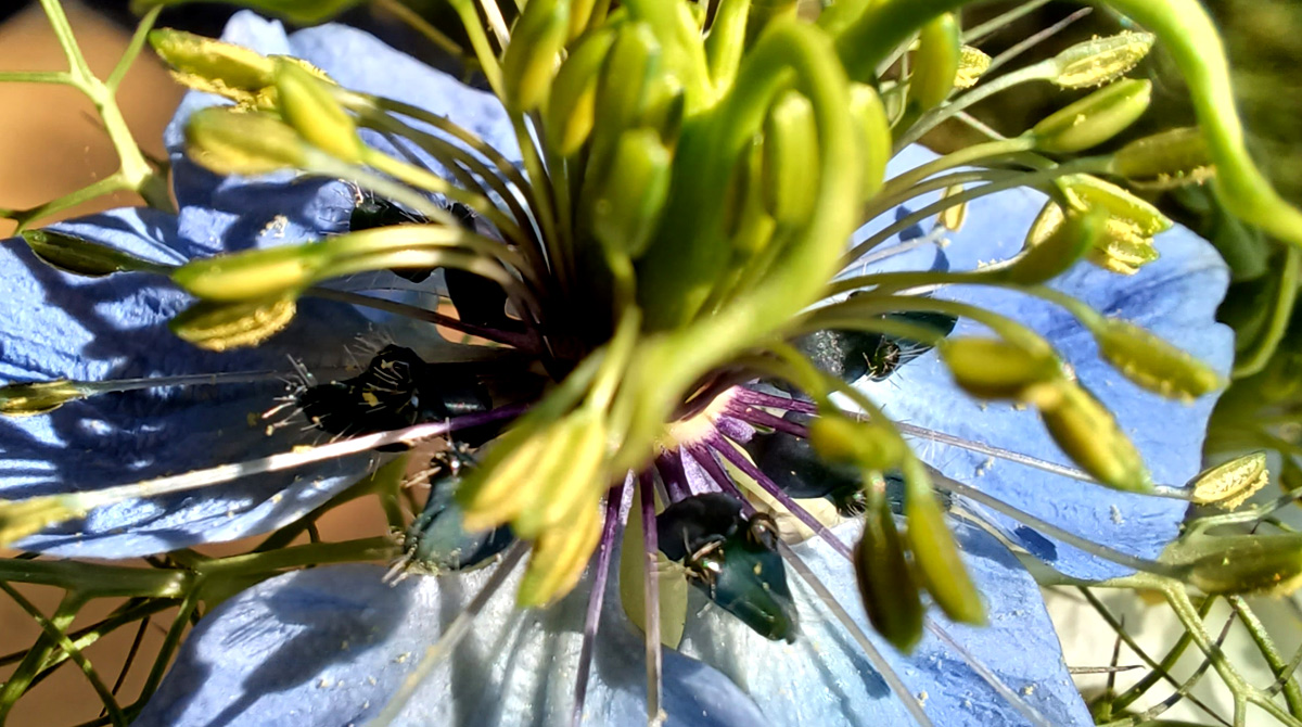 Das Rätsel ist wohl zu kompliziert. Die scheinbaren Ameisenköpfe sind Teile der Blüten von Nigella damascena, der Jungfer im Grünen.