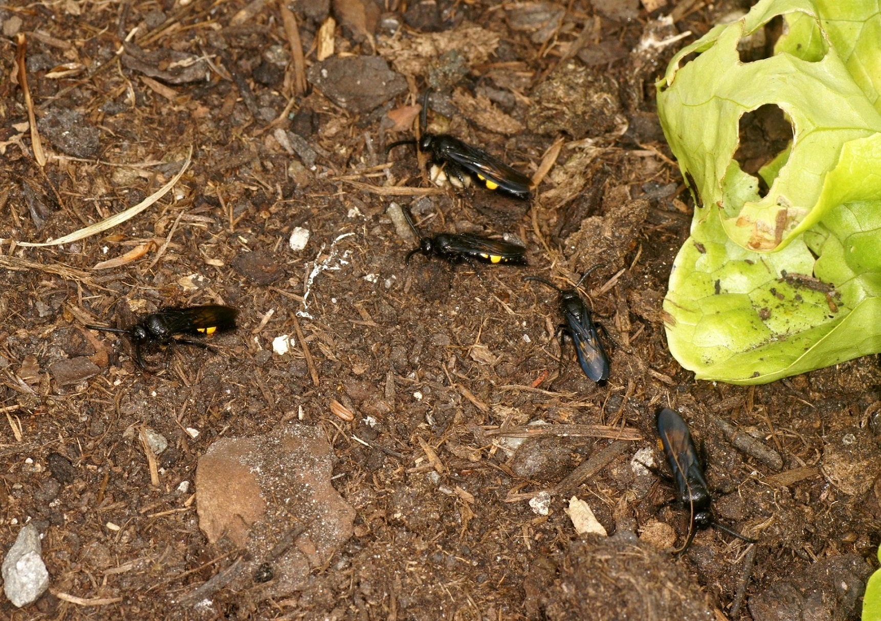 Trotz vieler Fotos, Geduld und Schwitzen gelang kein scharfes Foto im Anflug bei ungefähr 20 beobachteten "beladenen Flügen" der Wespen in die Brutkolonie mit Beute in der Luft. Welches Loch angeflogen wird, war nicht vorhersehbar. Die Wespenweibchen steuern nach Schleifenflügen sofort den eigenen Nesteingang an und verschwinden augenblicklich mit der Beute darin.