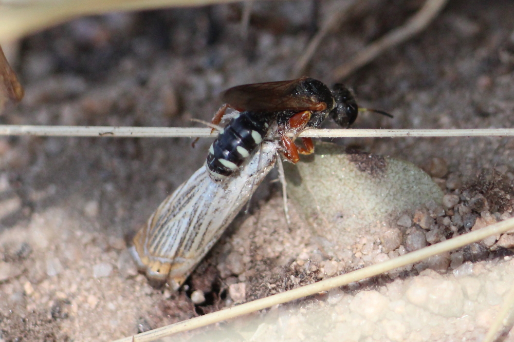 Dank des "silbernen Mundes" konnte Merkur das Rätsel lösen. Schmetterlinge sind die Beute dieser wohl selteneren Grabwepsen mit Brutfürsorge.