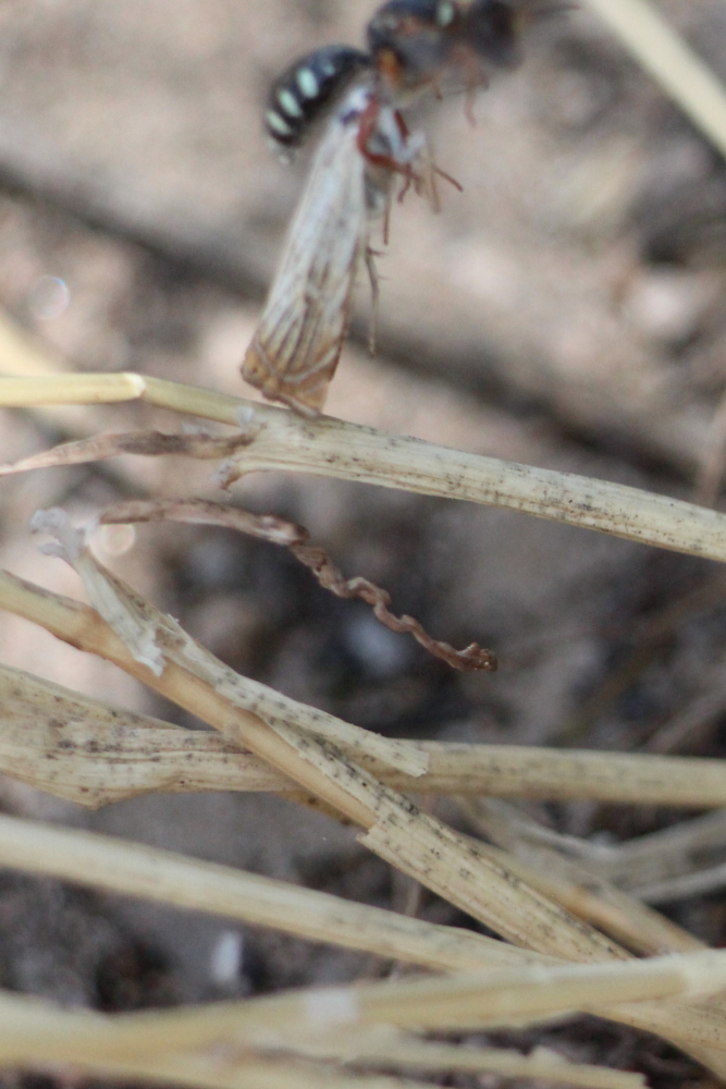 - an einem Grashalm kollidierte die Wespe mit dem Rispengraszünsler vor der Nestöffnung