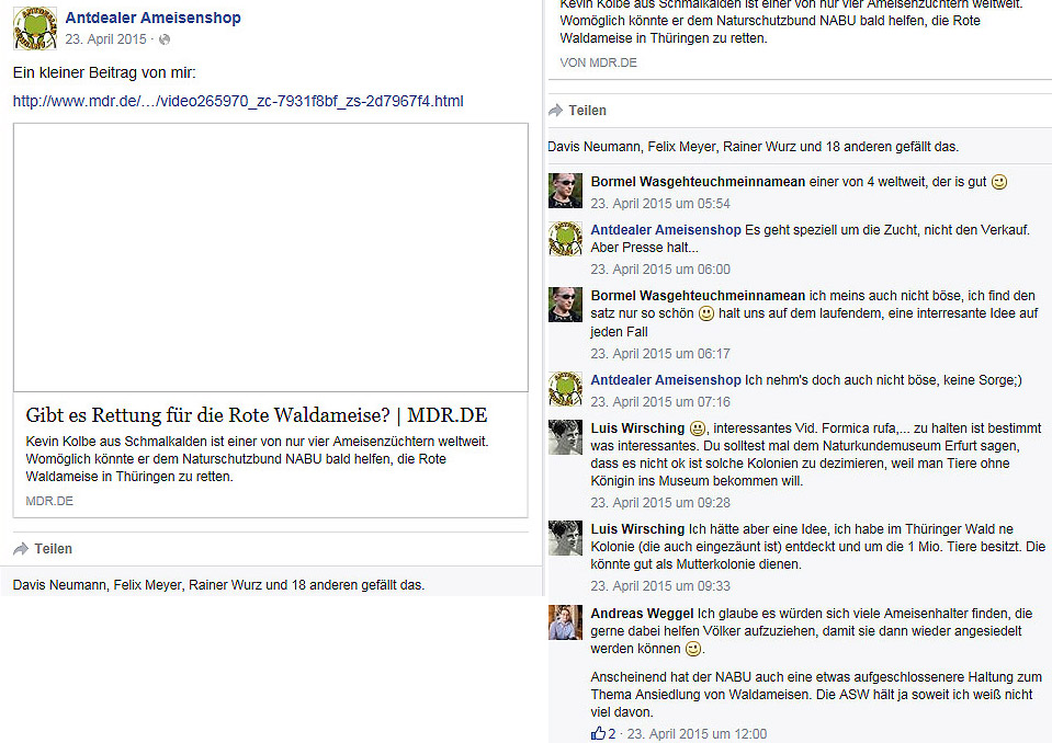 Tatkräftige Hilfe für die Waldameisen ist möglich: Seht Euch doch nur mal an, wie viele Waldameisenvölker von den Ameisenschutzwarten, auch der von Thüringen(!) umgesiedelt werden müssen: http://ameise-fleischmann.homepage.t-on ... ertung.htm Allerdings kann man damit kein Geld verdienen.