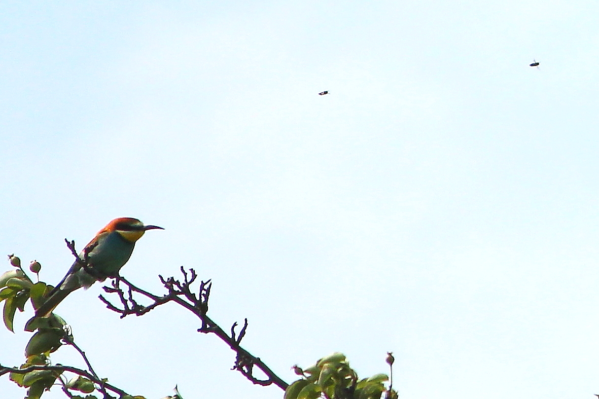 Auf meinen Fotos der Bienenfresser vom Mai 2018 habe ich die Bienen (oder Wespen?) erst später entdeckt.
