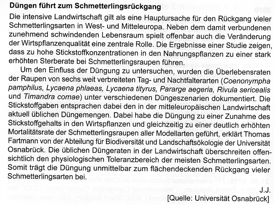 Darunter eben auch die oben erwähnte Überdüngung. Nicht nur durch direkte Düngung, sondern noch weitreichender, durch Stickstoffeintrag über die Luft. Dadurch sind eben selbst Naturschutzgebiete gefährdet, da selbst dort eine schleichende Veränderung der Vegetation stattfindet. So werden nicht nur Futterpflanzen durch Dünger quasi vergiftet, sondern es verschwinden auch etliche Pflanzenarten die mit zu viel Stickstoff nicht klarkommen. Diese fehlen natürlich dann als Futterpflanzen und somit verschwinden auch die darauf angewiesenen Insektenarten.