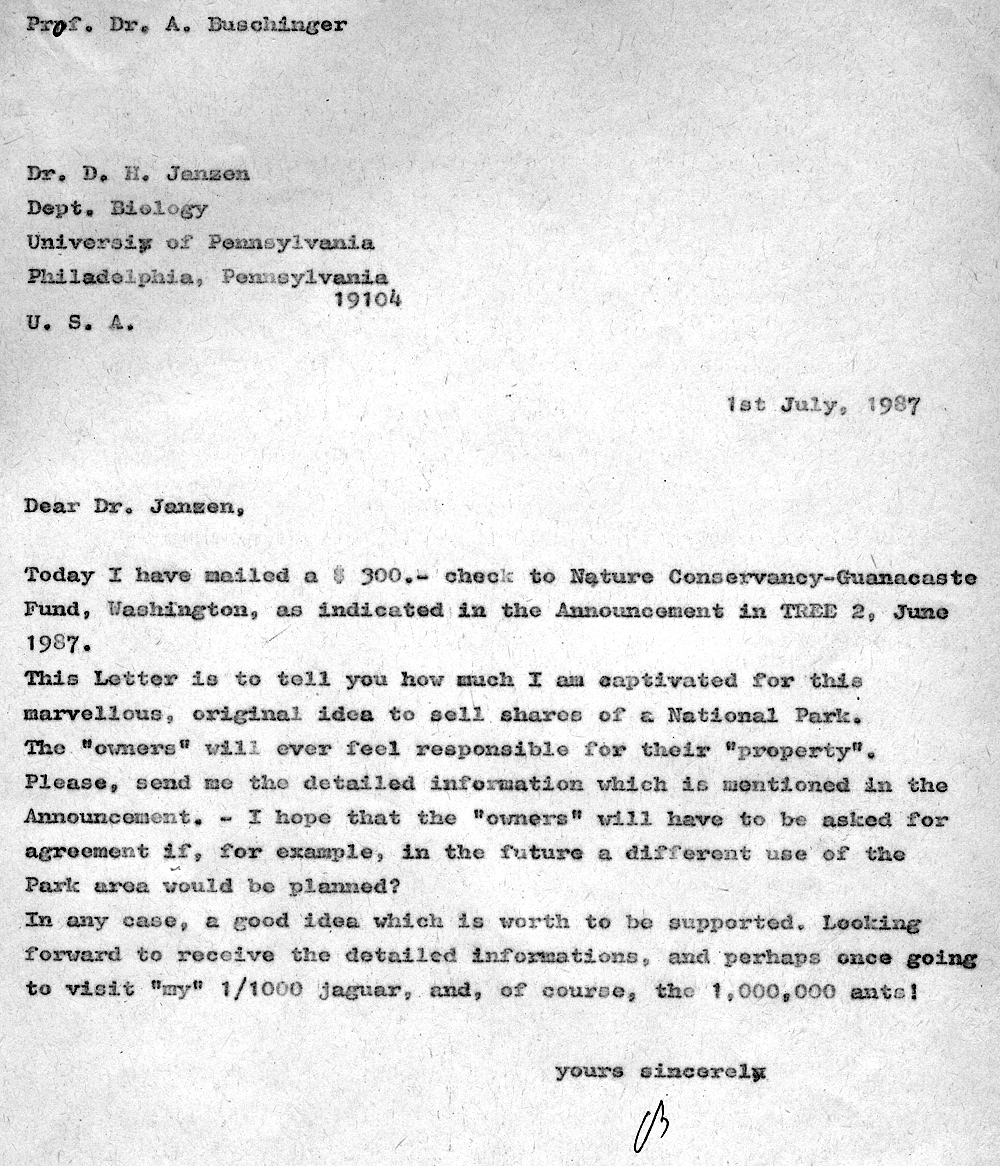 In 1987 erschien in der Zeitschrift TREE (Trends in Ecology and Evolution) eine Anzeige des amerikanischen Biologen Daniel H. Janzen mit dem Angebot, für 300,- US$ einen Hektar (10.000 qm!) Trockenwald im geplanten Guanacaste Nationalpark in Costa Rica zu kaufen. Einschließlich einem fünftausendstel Vulkan, einem eintausendstel Jaguar, und 1.000.000 Ameisen (!)...