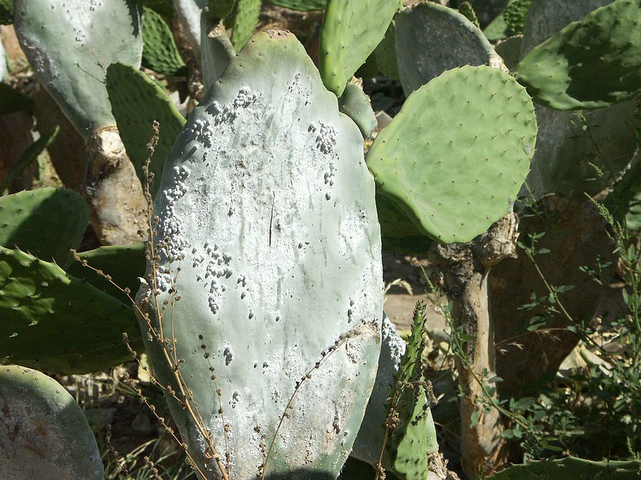 Der Wachsstaub der Läuse verfärbt die Opuntienglieder ins Weißliche