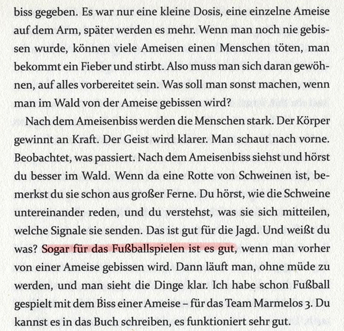 Auf S. 104 ist die Rede von einer bestimmten Ameisenart, deren „Biss“ (gemeint ist sicher der Stich) in der Ausbildung der „jungen Krieger“ eine Rolle spielt.