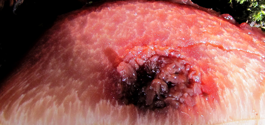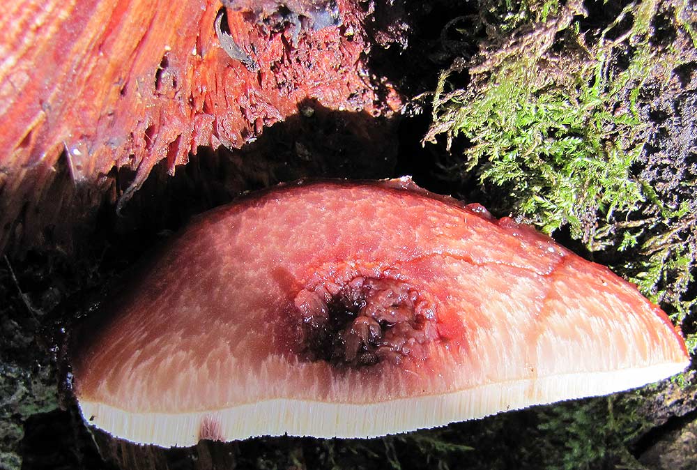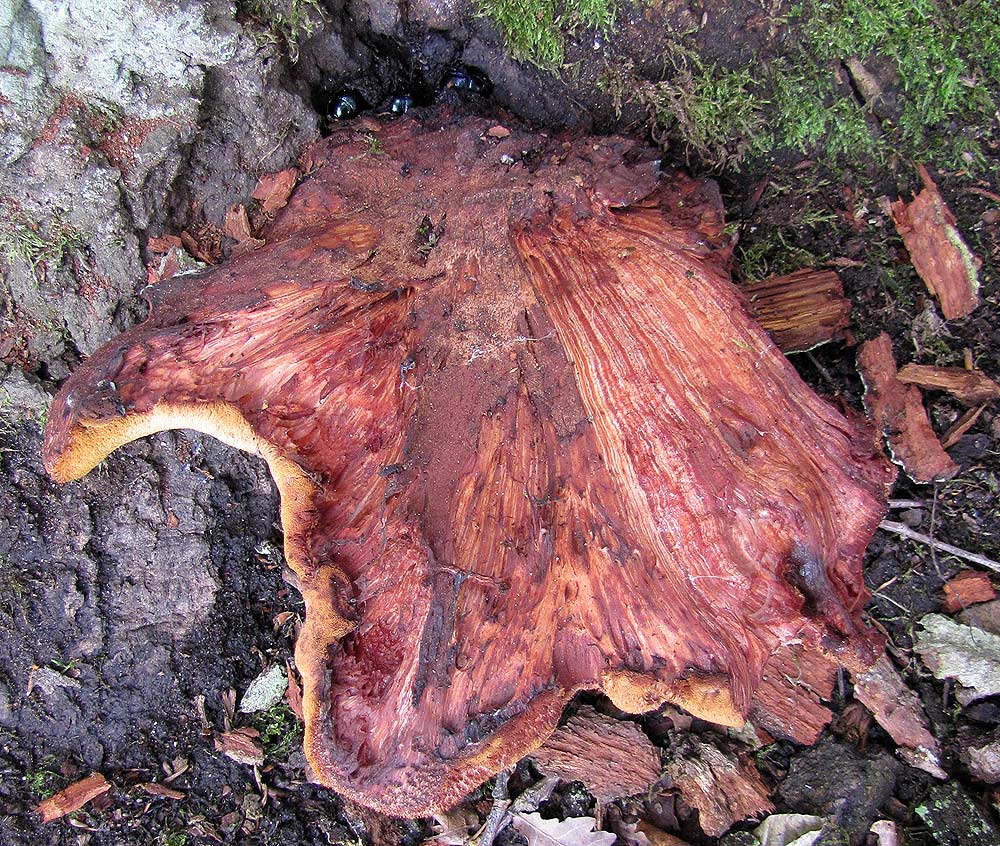 Im frischen Zustand ist er oberseits rot bis dunkelrot zu braun (daher Leberpilz). Hier ist die Deckschicht bereits abgefressen, so dass