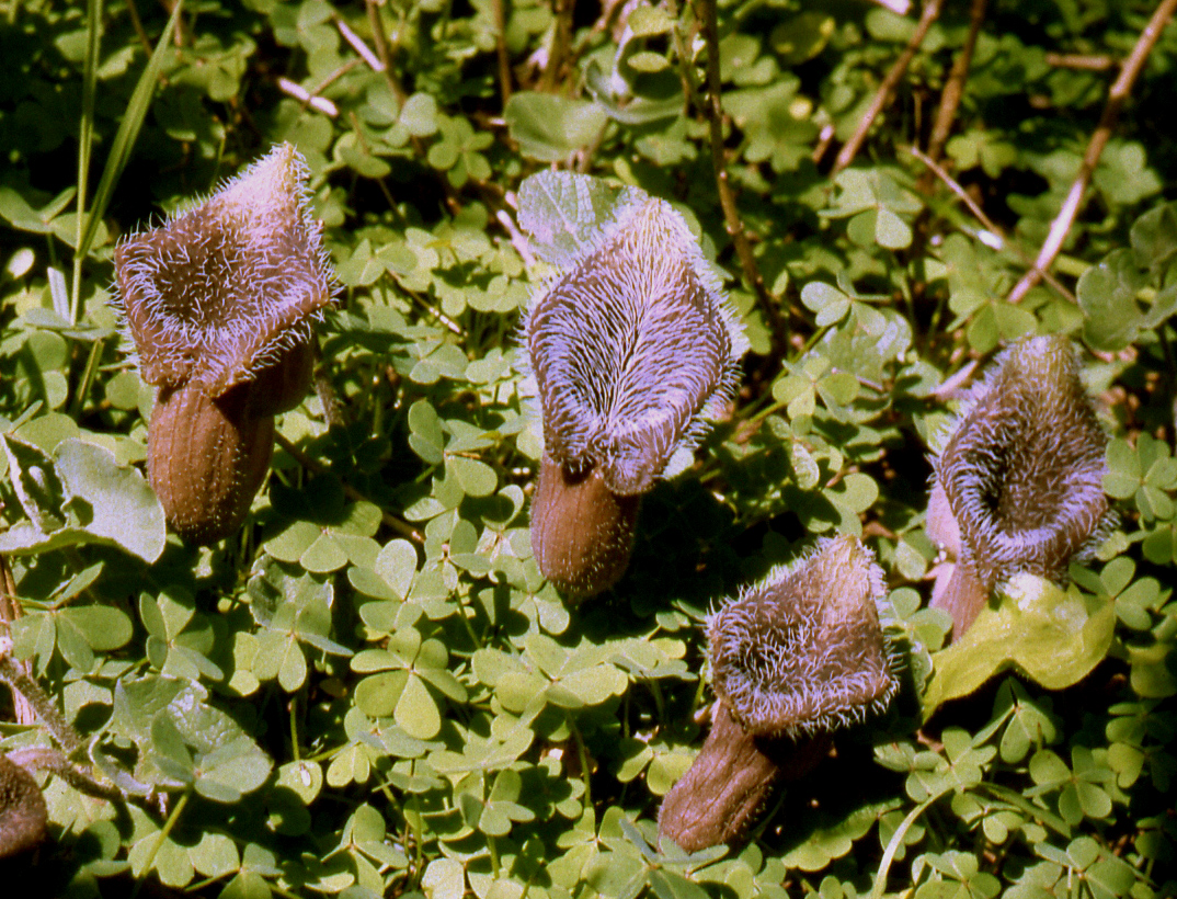 Die Behaarung und die Grundfarbe erinnern an etwas Animalisches, Säugetier-ähnliches. Die Pflanze lockt mit Aasgeruch Fliegen etc. an, die hineinkriechen bis in den angeschwollenen Bereich, wo die männlichen und weiblichen Blütenorgane liegen. Die nach innen gerichteten Haare verhindern das Entkommen. Ist die Blüte bestäubt, vertrocknen die Haare, so dass die mit Pollen behaftete Fliege wieder freikommt und in eine benachbarte „Falle“ gehen kann.