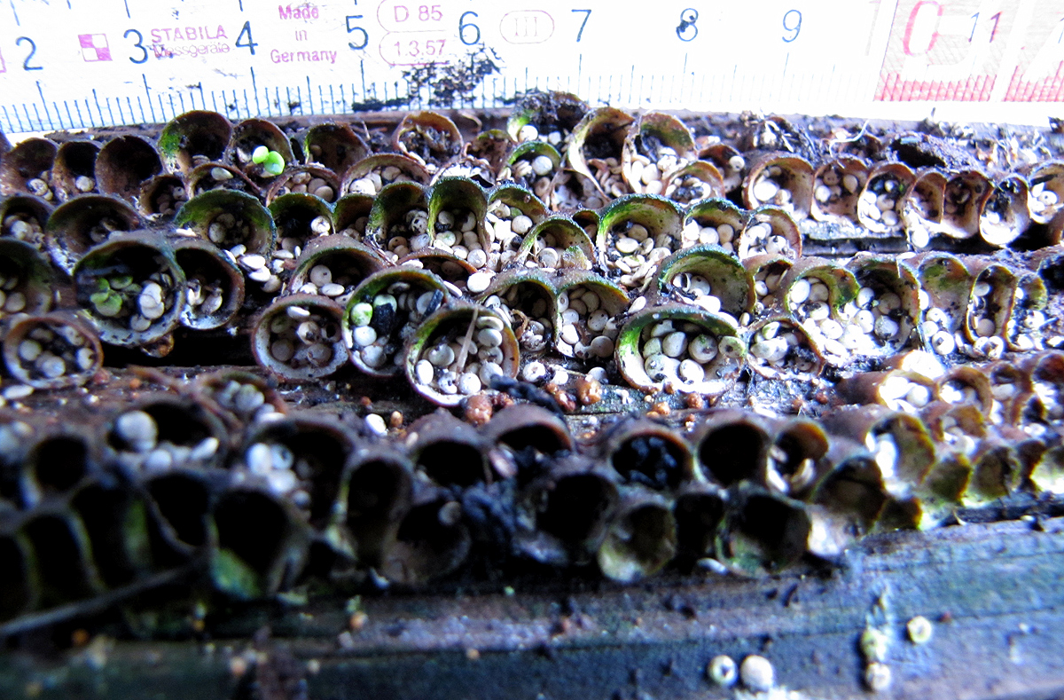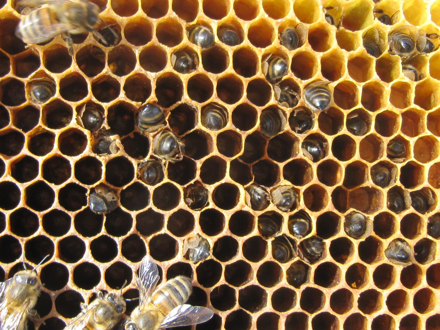 Denn die Bienen sind verhungert, sie sind während der Futtersuche in den leeren Zellen verendet.Trotz - bzw. gerade wegen der vorangegangenen Fütterung.