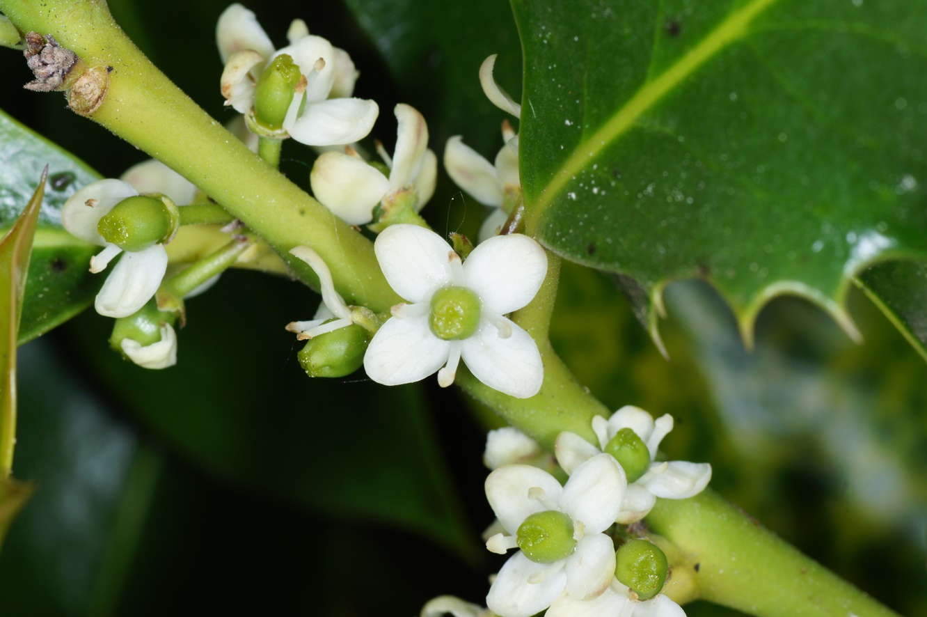 Nachdem sich niemand an der Auflösung des Rätsels vom 1.5. beteiligt, löse ich es hiermit auf: Es handelt sich um Ilex aquifolium, einen immergrünen Strauch/Baum, der mit seinen kleinen, unscheinbaren Blüten (Durchmesser viell. 7mm) als Insektenmagnet entpuppt: Das ununterbrochene Summen der Honigbienen ist deutlich hörbar. Ich habe schon darauf hingewiesen, dass auch Wespen- und Hornissenköniginnen die kleinen Blüten besuchen. Ich habe im Garten drei Ilex-Bäume: Neben der erwähnten Art Ilex camelliifolia und Ilex crenata.