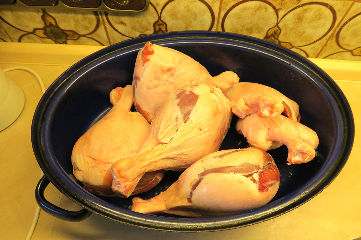 Meine Frau sprach von 9 Gästen, minus ein Vegetarier, plus wir zwei, gibt 10, und so viele Gänsekeulen hatte sie eingekauft. Doch die Pfanne enthielt scheinbar nur vier sehr