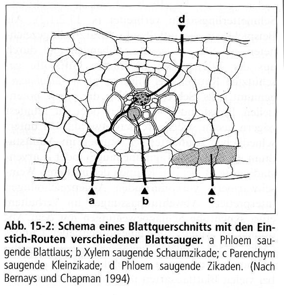 Die wertvollen Inhaltsstoffe sind im Phloem zu finden! Und so können Blatt- und Rindenläuse ihre sehr beweglichen Rüssel mit den Steckborsten ganz gezielt zwischen mehreren Lagen Rinden- und Parenchymzellen sowie vorbei an Xylem und Harzkanälen in eine Siebröhre versenken. Deren Inhalt steht unter Druck, so dass der Pflanzensauger nicht einmal viel saugen muss; der Phloemsaft durchströmt den Verdauungstrakt der Laus ganz von alleine. Der Darm filtert den geringen Anteil an Aminosäuren heraus und scheidet den zuckerhaltigen Rest über den After als Honigtau ab.